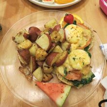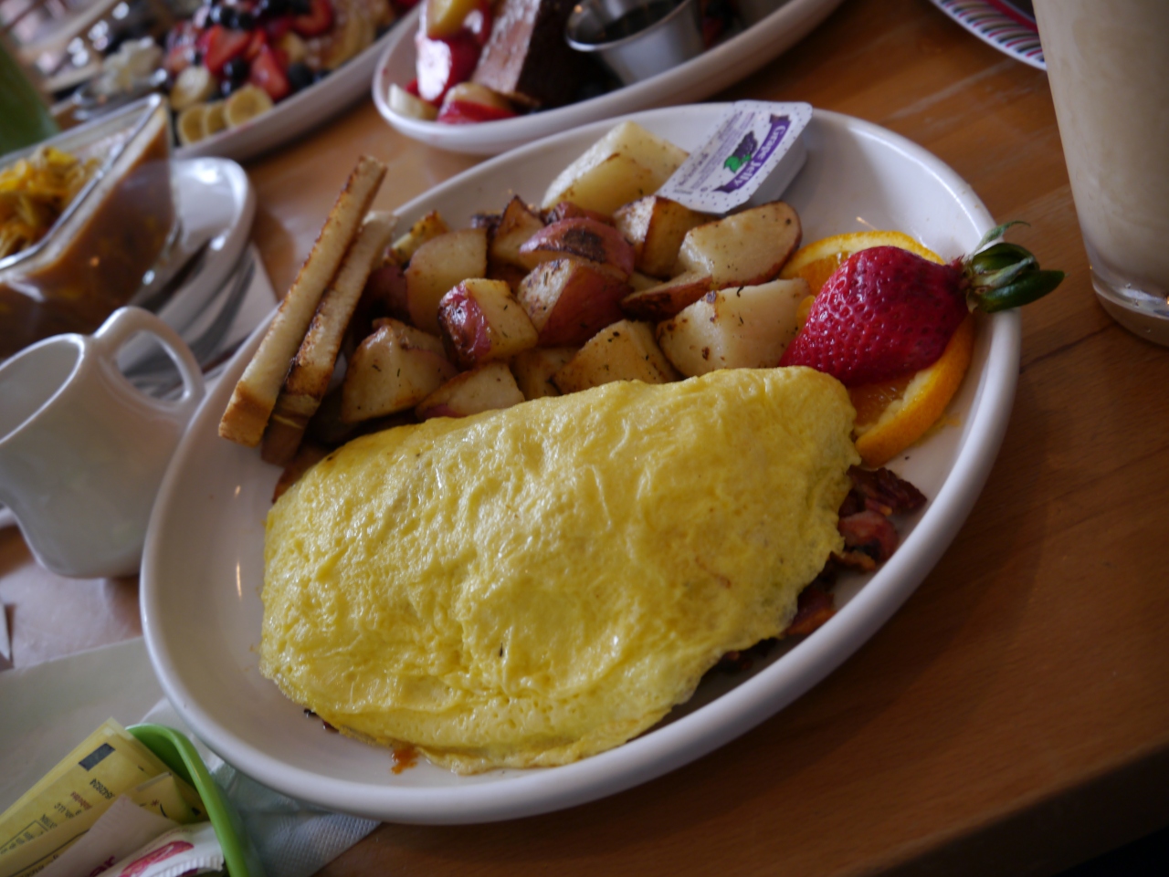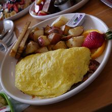 3人家族でパンケーキ(トッピングはフルーツ全て)1個とオムレツ1個を注文。どちらも量が非常に多く、パンケーキは繊細さに欠け... 続きを読む「おいしい!」という感動はありませんでした。日本のホットケーキにただゴロゴロと果物をのせたに過ぎない感じ。(パンケーキ自体はふわふわでおいしい、という感想は女性陣から。)オムレツも味は悪くはないけど塩辛くて、まったく美味しさを感じることができず、結局どちらも残しました。我が家は、普段決して食べ物を残すようなことはしないのですが、とても最後まで食べようとは思えませんでした。金額的にも安くなかったのでガッカリして帰りました。