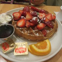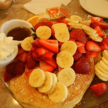 日本語メニューはありませんが、パンケーキのフルーツ全部のせは「all」で分かってもらえました。我が家は私と主人、中学生の娘の3人でパンケーキのフルーツ全部のせ2つをシェアして充分な量でした。パンケーキは3枚でフワフワ!!フルーツはイチゴ・バナナ・ブルーベリー・焼きリンゴ。焼きリンゴは少し甘かったですが、他のフルーツはフレッシュでとても美味しかったです!パンケーキのお店は3件行きましたが、一番美味しかったです。