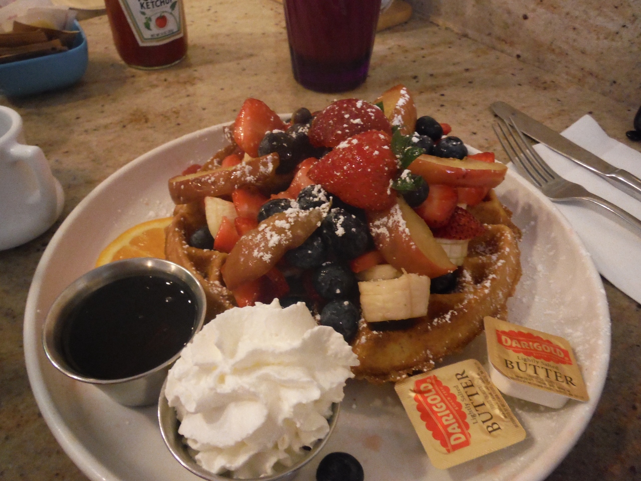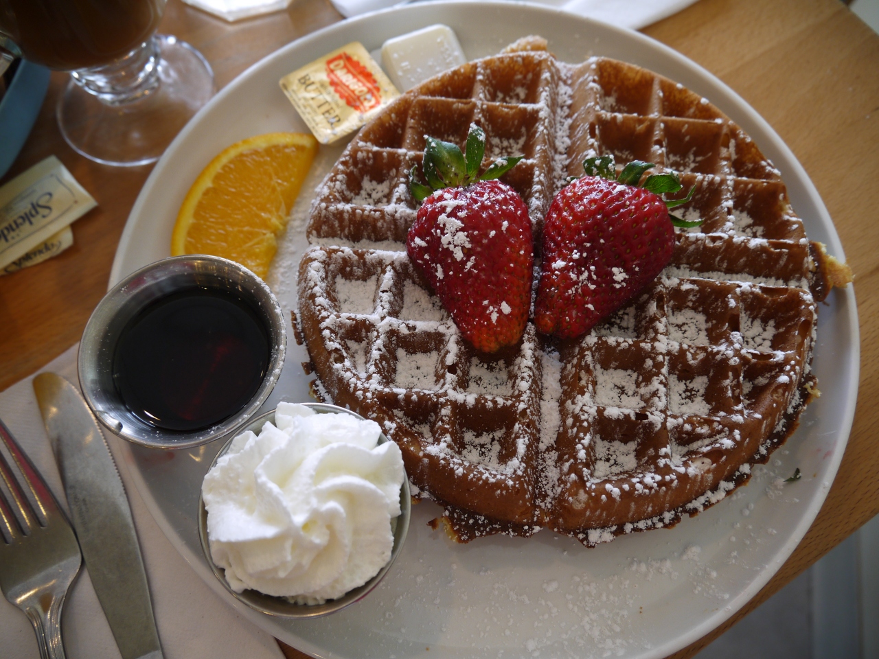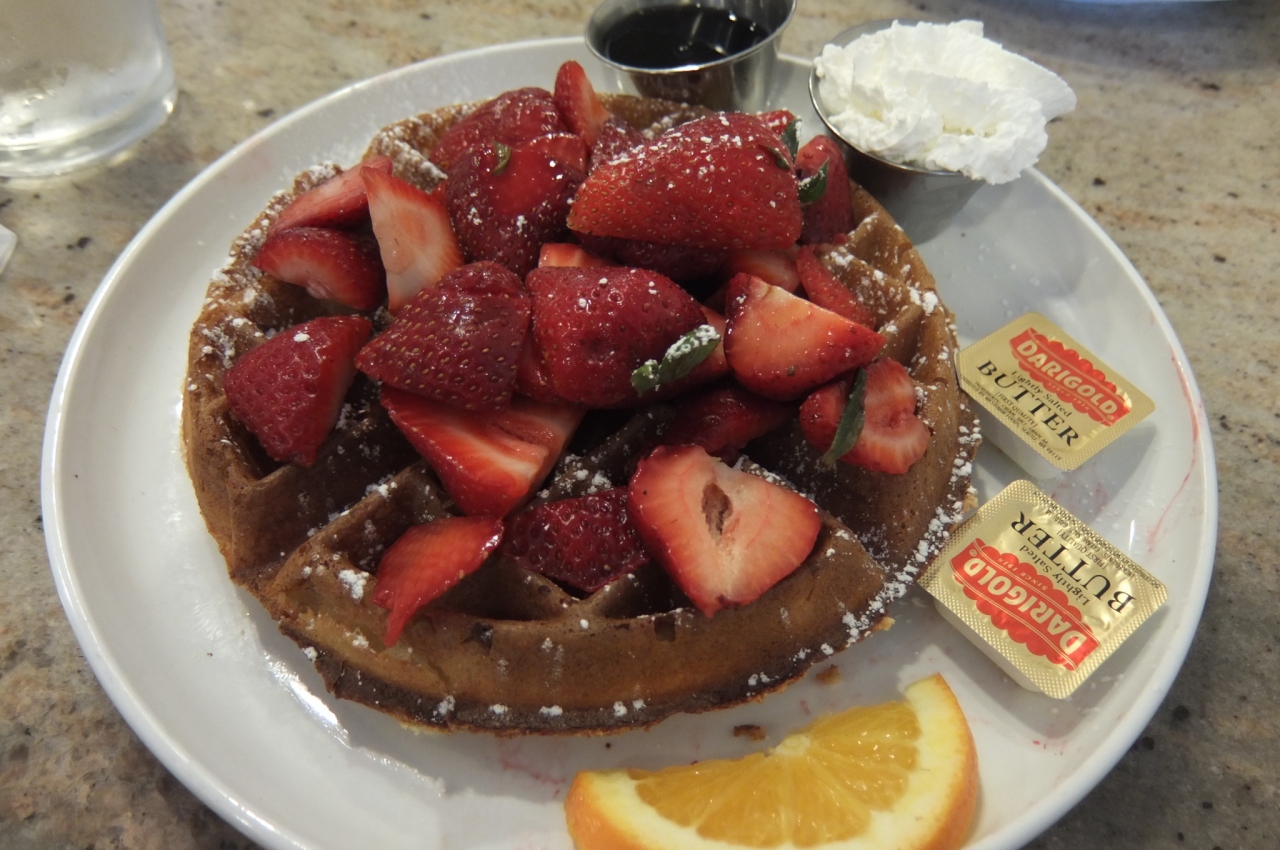 私たちが注文したのは、ワッフルにイチゴトッピングとミート&チーズのオムレツ。