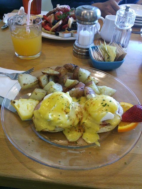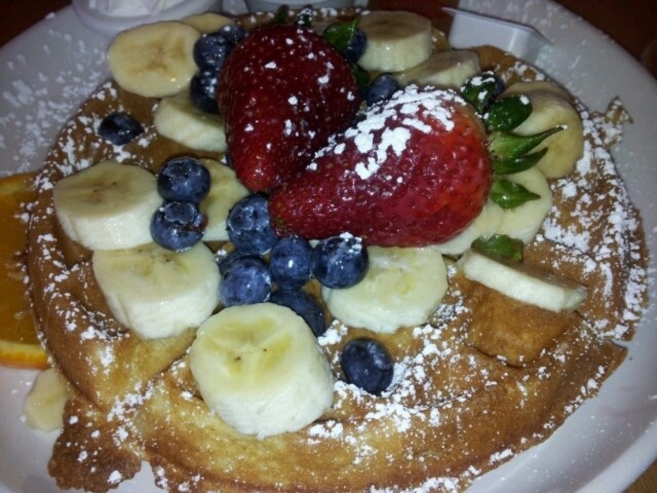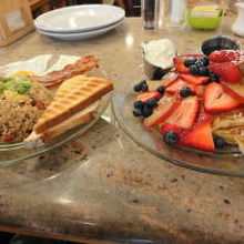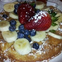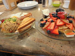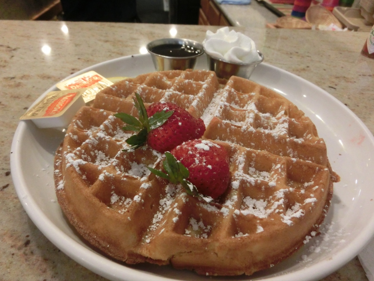 私たちが注文したのは、ワッフルにイチゴトッピングとミート&チーズのオムレツ。