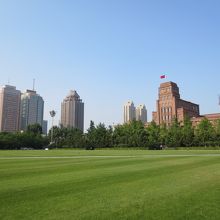 裁判所や市役所などの建物に囲まれた、緑鮮やかな芝生の広場です。