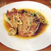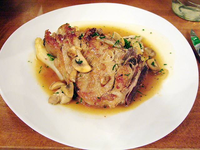 メインには8ユーロをプラスして仔牛の背肉。キノコやにんにくを合わせてドン! という、見た目豪快なビストロ料理。日本のように微妙な火加減、というものはありません。しかし、元の肉がいいのか、けして固くなったりはしていません。ナイフで十分切れますし、噛むと肉汁もたっぷり。塩加減もぱっちり。でも、もうおなかいっぱいです。