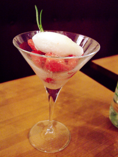 いちごの赤ワインソース、カルダモンのビスケット等。