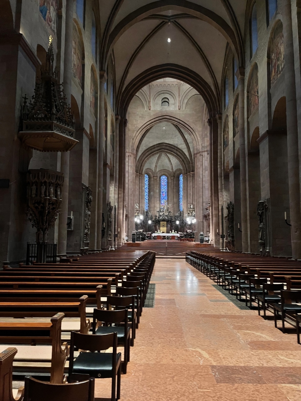 バーデンで温泉... 続きを読むも魅力的でしたが、全裸らしく、流石無理!!と、その手前のマインツの街に…Sバーンで45分.ドイツで3本の指に入る壮大な教会らしく、確かに迷いそうなほど中が広かったです!