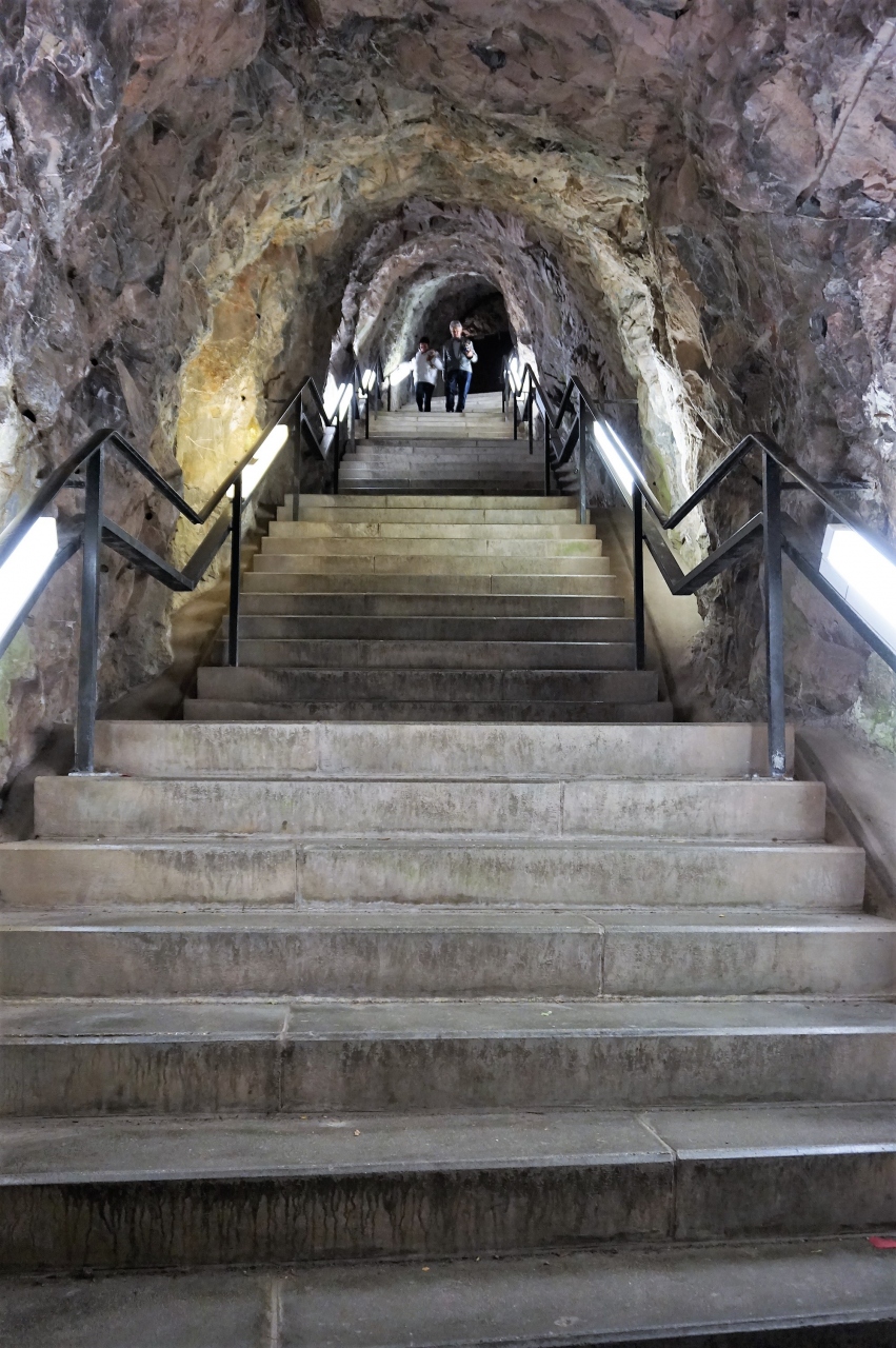 祭壇の後ろ側の部分は、崖がむき出しになっていました。上部に通じる階段をのぼりきった場所が小さな展望台になっており、イダーオーバーシュタインの街を見下ろせます。