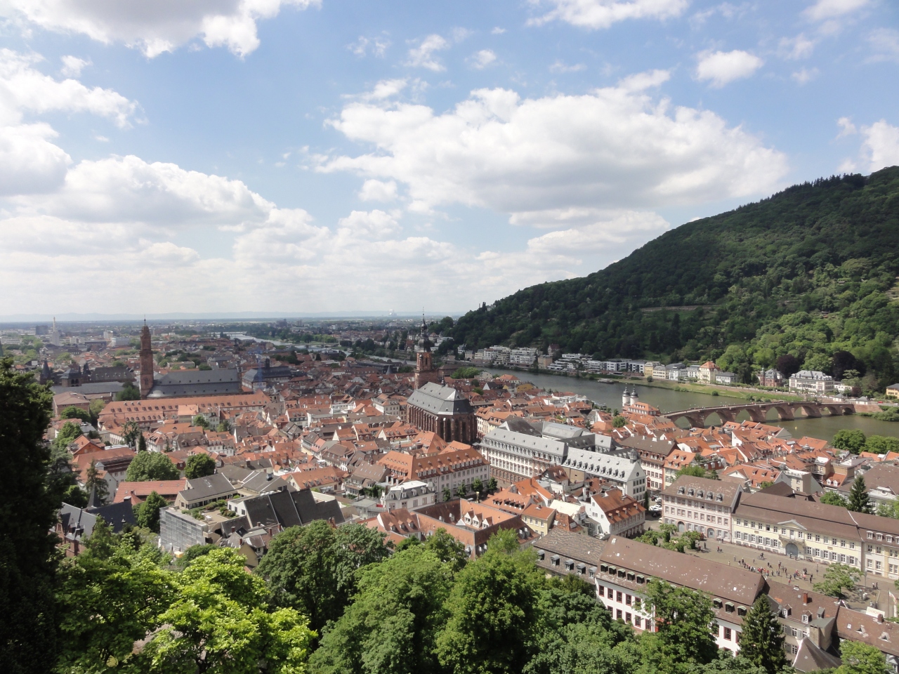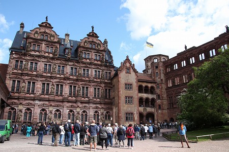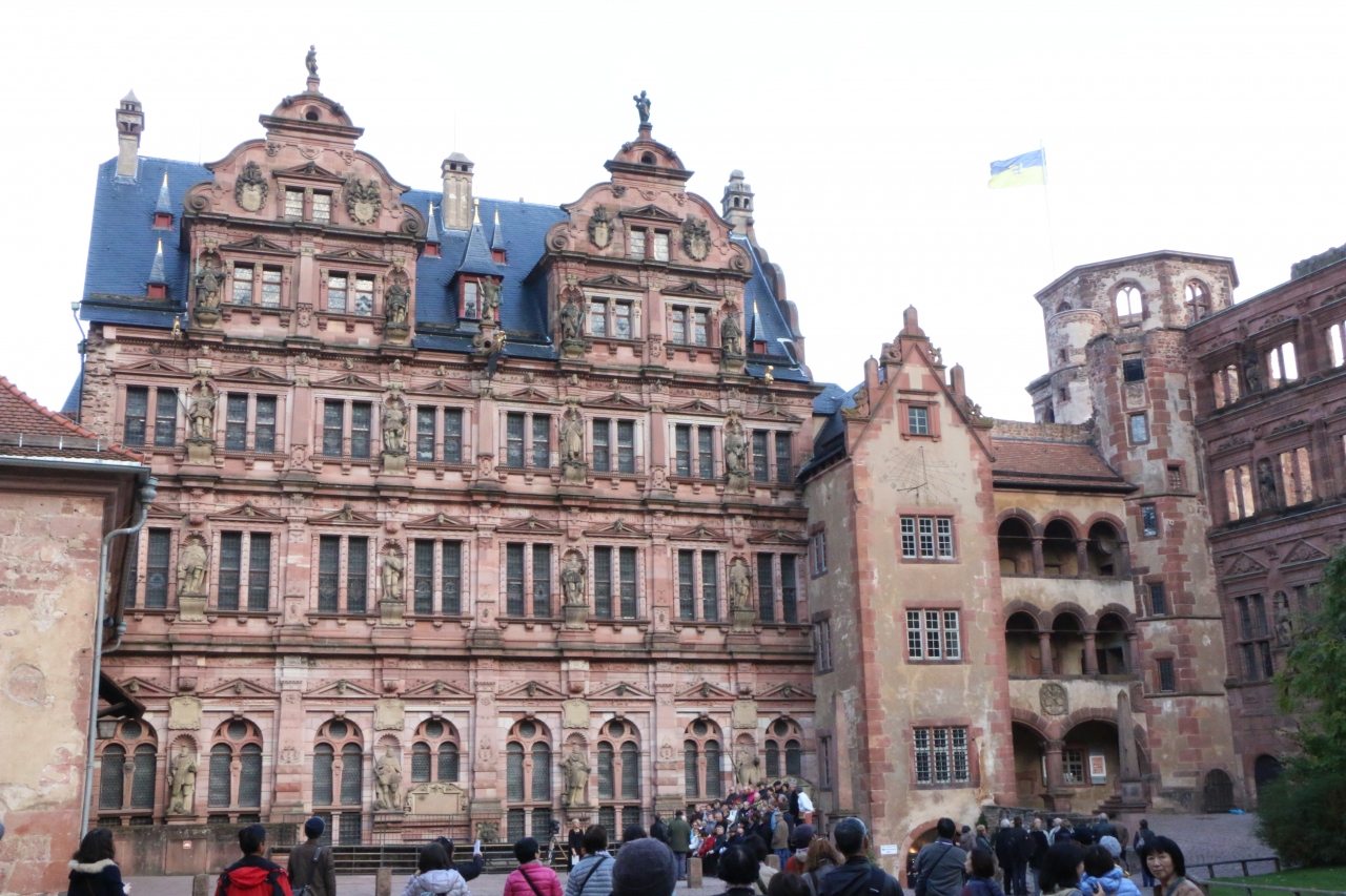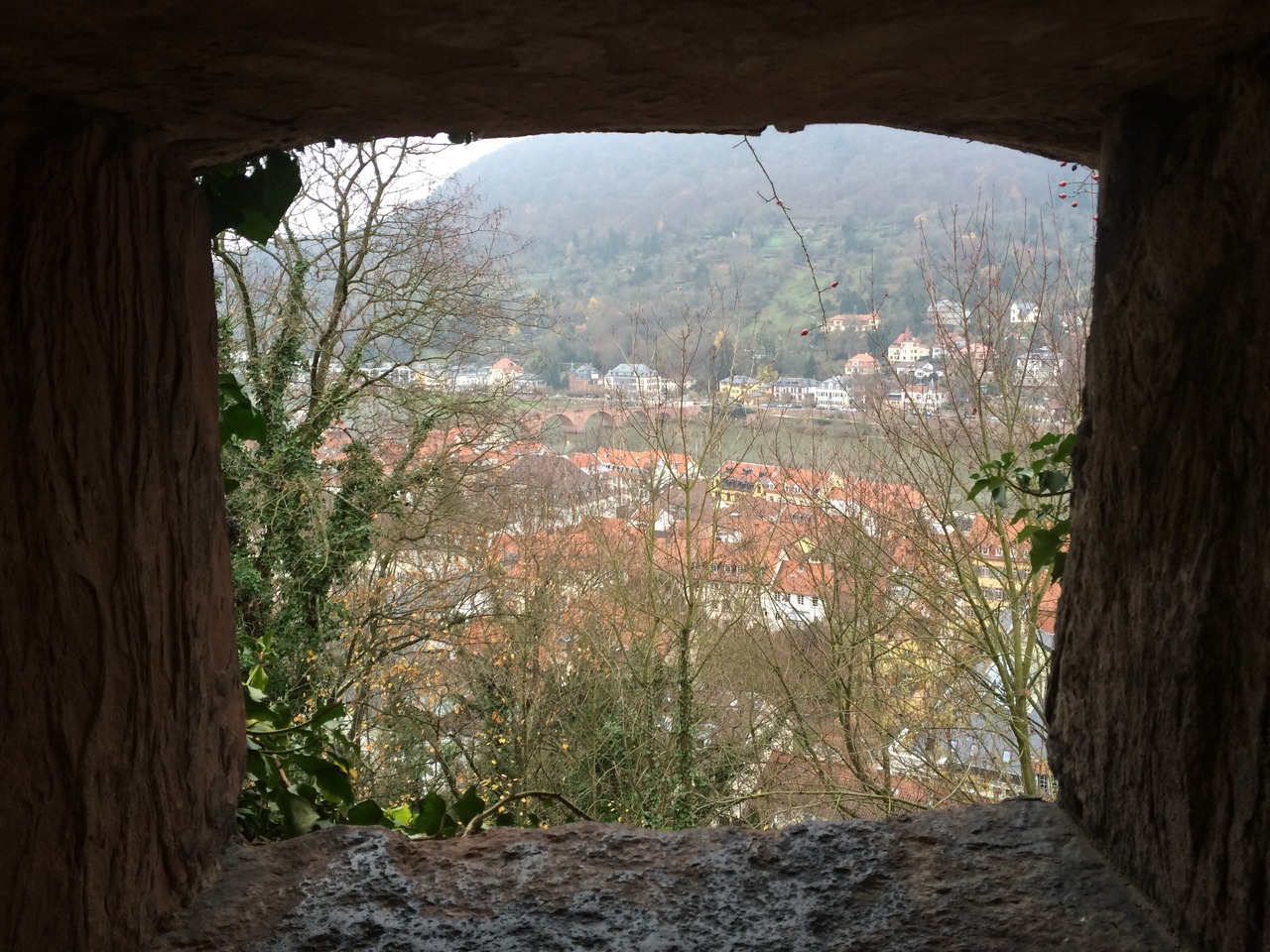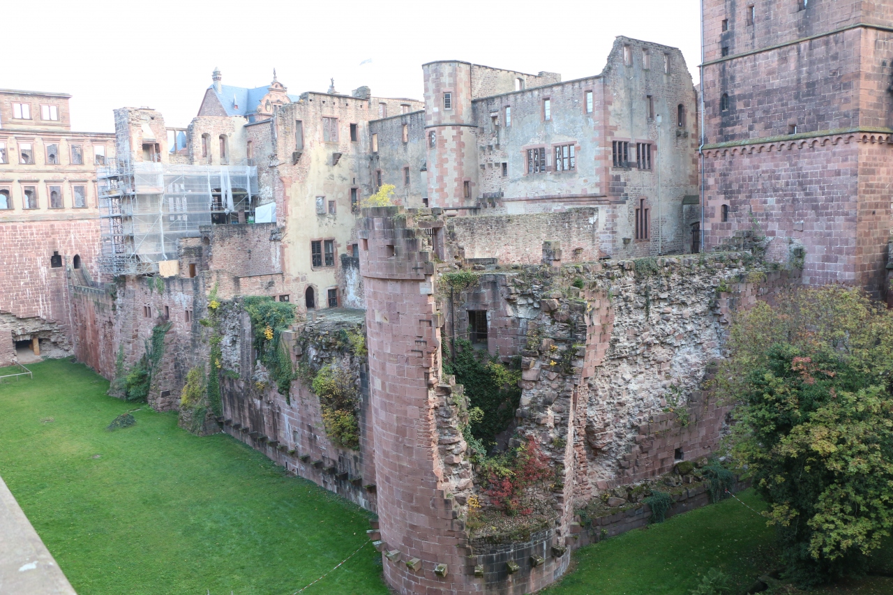 ツアー開始までの間や、ツアーに参加しない場合も、アーチをくぐった先が広場になっていて、正面にお城、右手に薬事博物館があるので、まずはお城の右脇の小さなアーチを入りましょう。その先が展望スポットのバルコニーになっていて、ハイデルベルクの街並みのパノラマが素晴らしいです。