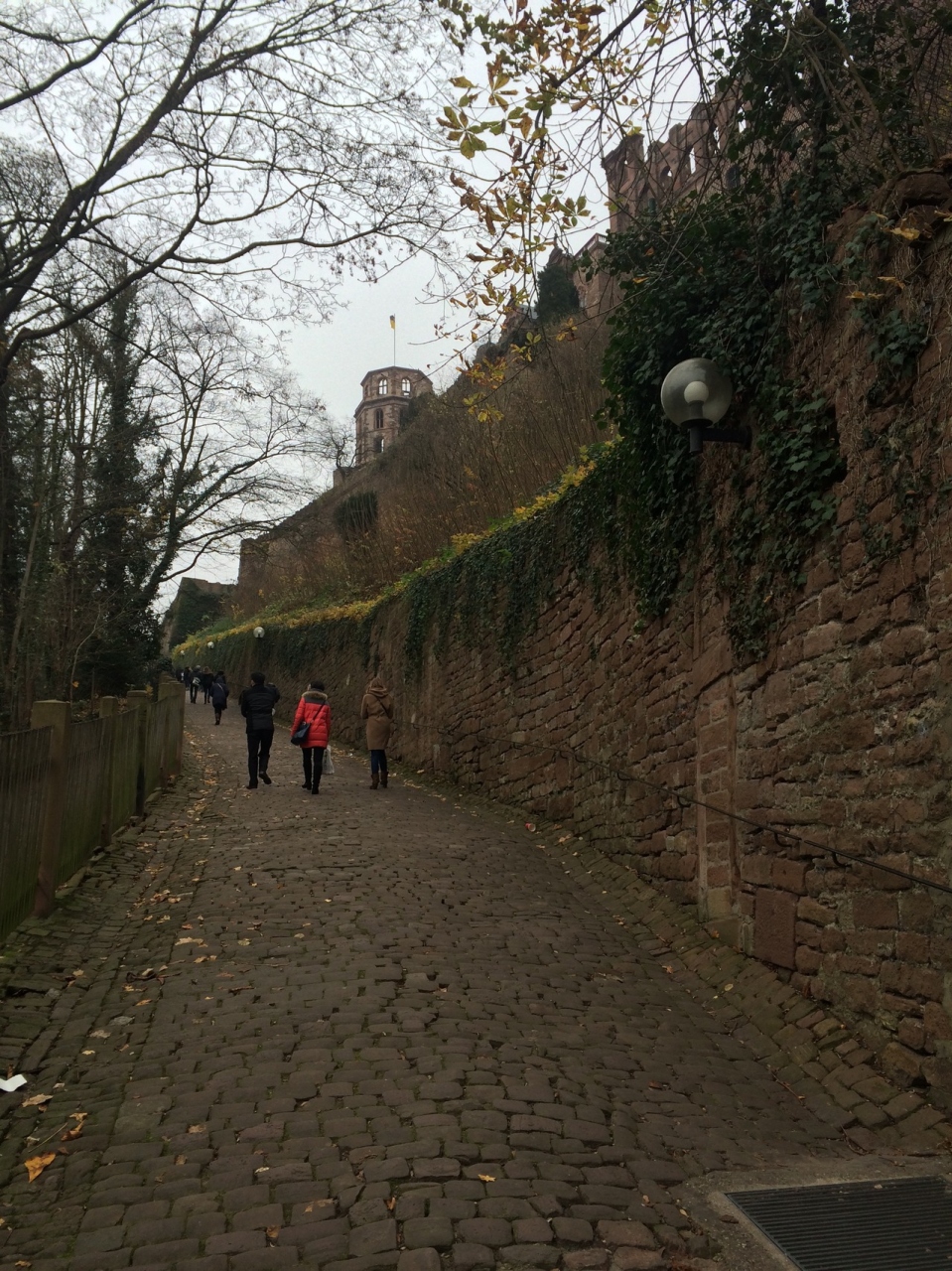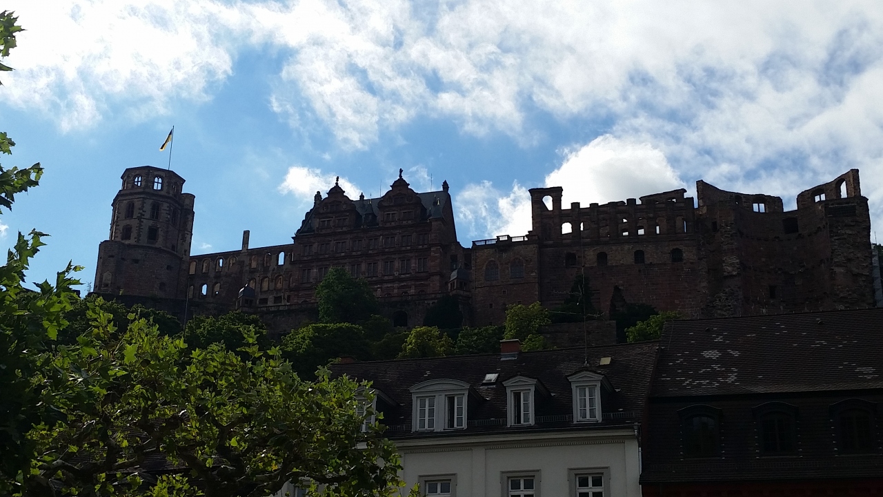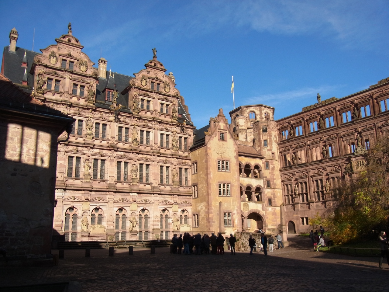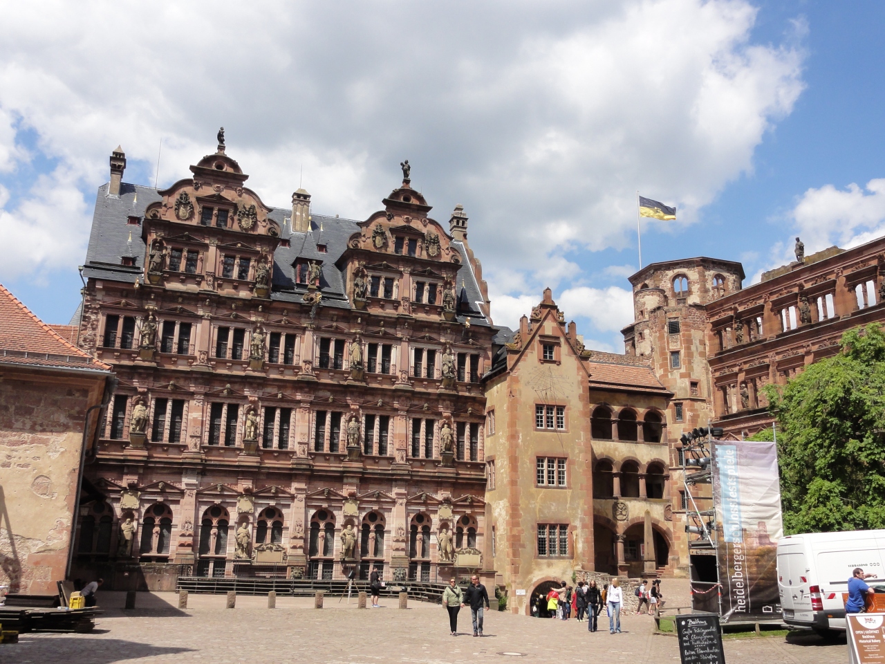 ツアー開始までの間や、ツアーに参加しない場合も、アーチをくぐった先が広場になっていて、正面にお城、右手に薬事博物館があるので、まずはお城の右脇の小さなアーチを入りましょう。その先が展望スポットのバルコニーになっていて、ハイデルベルクの街並みのパノラマが素晴らしいです。