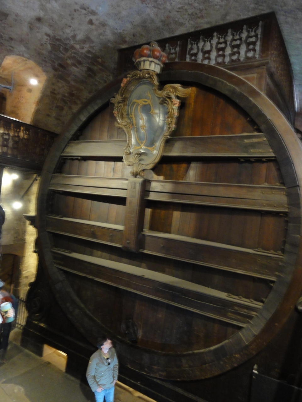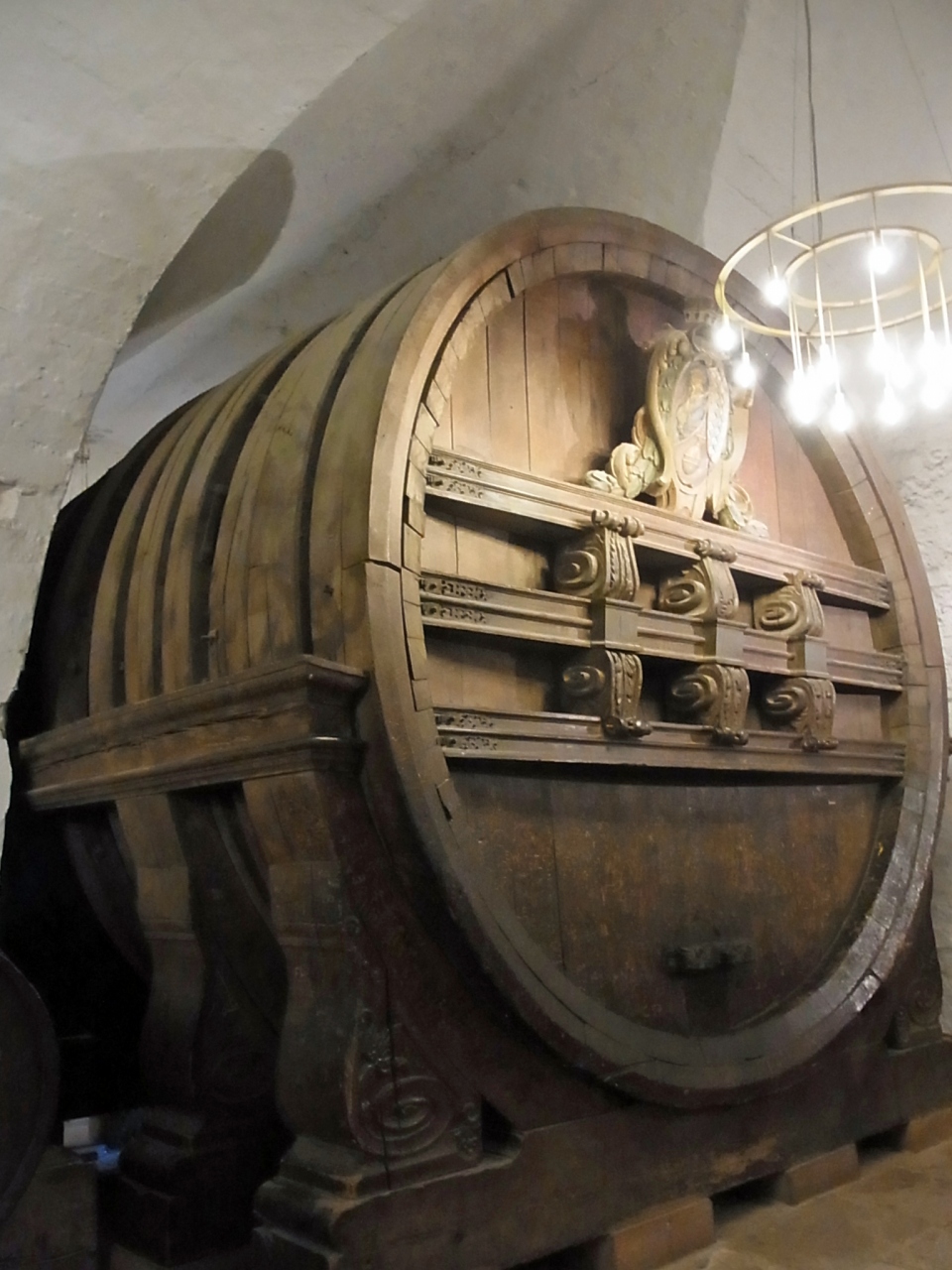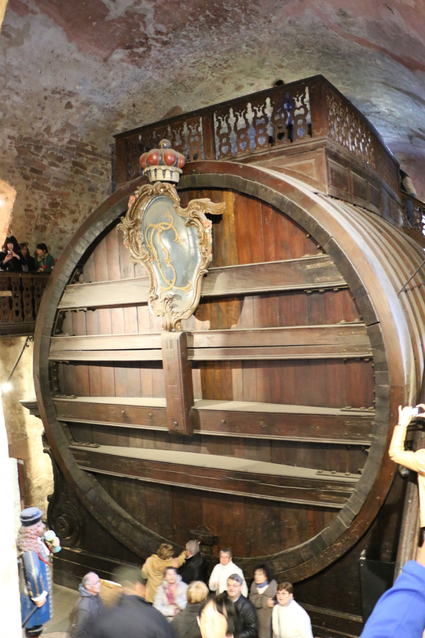お城の正面から左に下がっていくスロープをたどるとワインセラーに入り、ここには有名な大きなワイン樽があります。