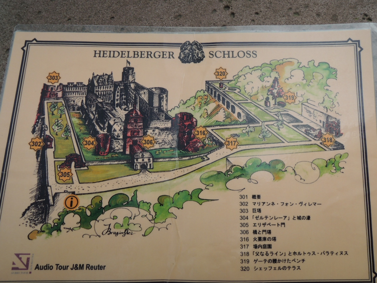 ハイデルベルク城の入場券売り場で、ガイドイヤホンと日本語案内図を借りました、セットで4ユーロでした。ラミネート処理された案... 続きを読む内図の番号をインプットすると、その場所の説明が日本語で聴くことができます。じっくり見て、聴いていると結構時間がかかります。ハイデルベルク城は13世紀にプファルツ伯の居城として建てられましたが、戦争や火事で破壊され一部再建されてはいますがほとんどは廃墟のままです。ロンデルという半円形に張り出したテラスからの見晴らしが良く、ネッカー川に架かるカール・テオドール橋(アルテ橋)、ハイデルベルク旧市街などすばらしい景色がながめられます。 閉じる