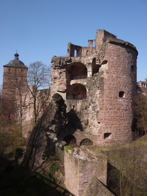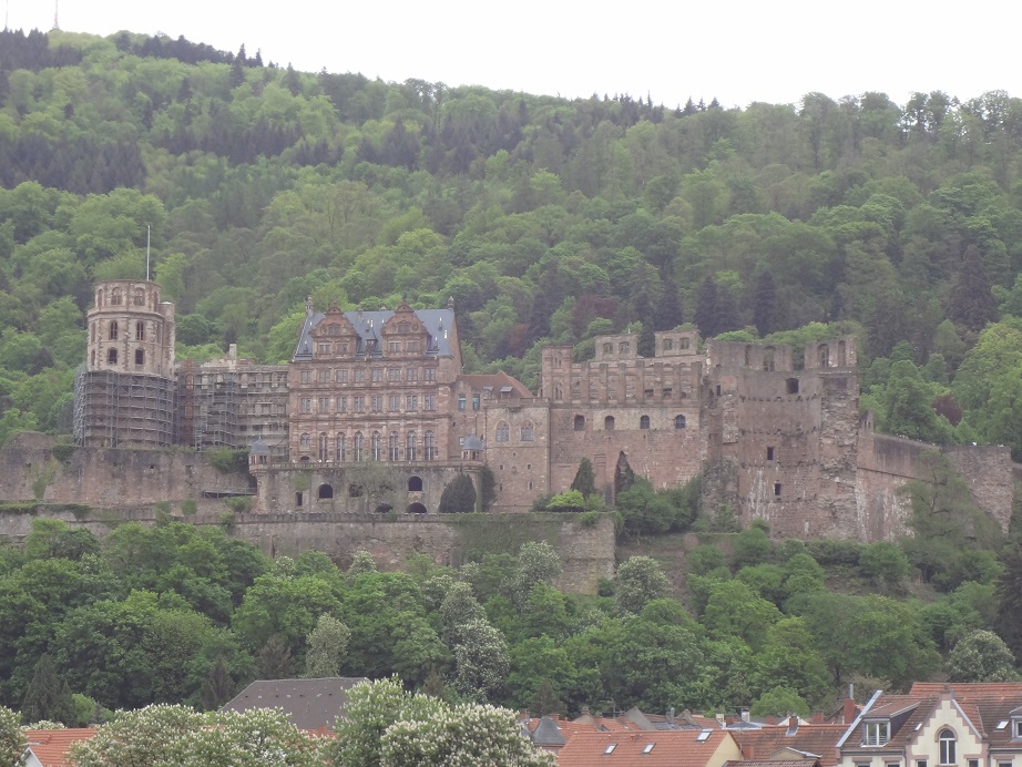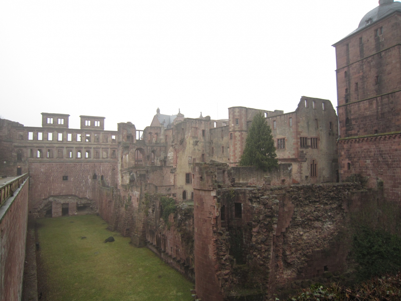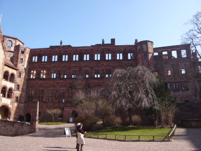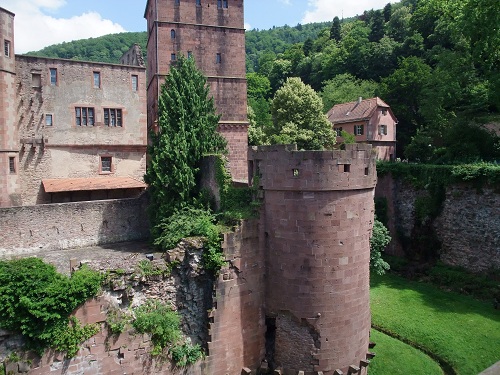 ハイデルベルグ城はネッカー川を護る小規模な城で、今は半分廃墟となっており、屋根は落ち、ゴシック、バロックなど様々な様式が見られる壁が印象的で、記憶を辿ることができる。