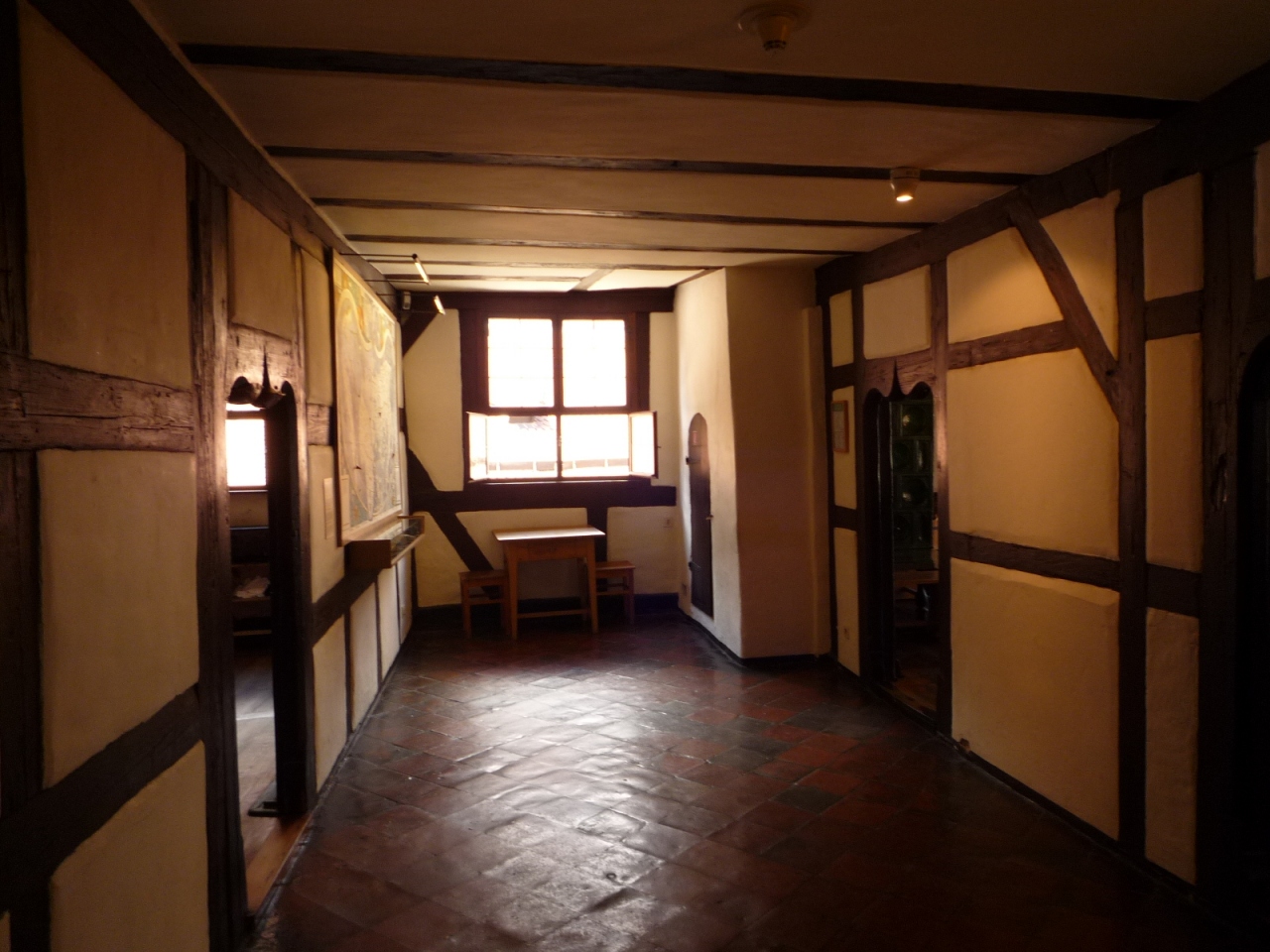 角に建っている。赤い木組みが印象的。