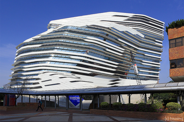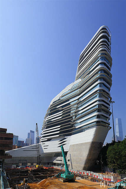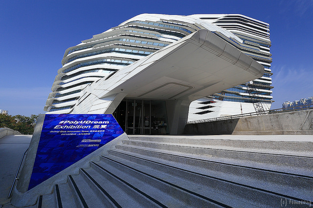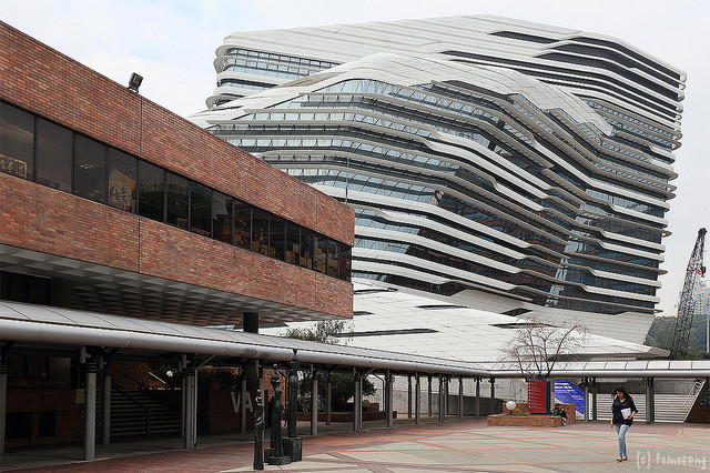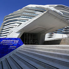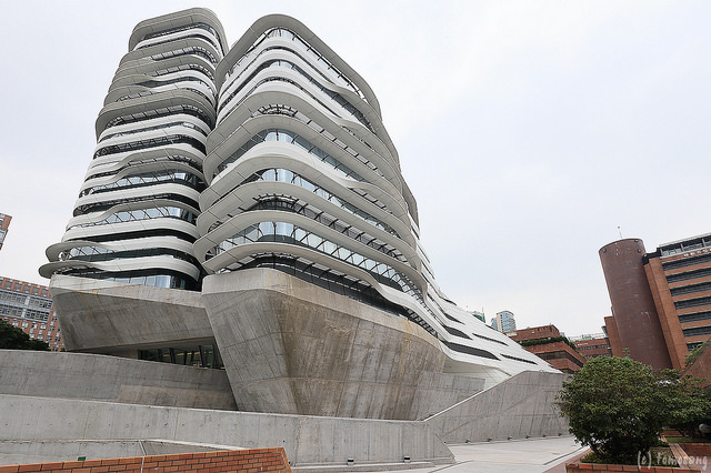 そして「ジョッキー・クラブ・イノベーション・タワー」という建物が建っています。日本では新国立競技場問題で騒がれた建築家ザハ・ハディド氏によるものです。