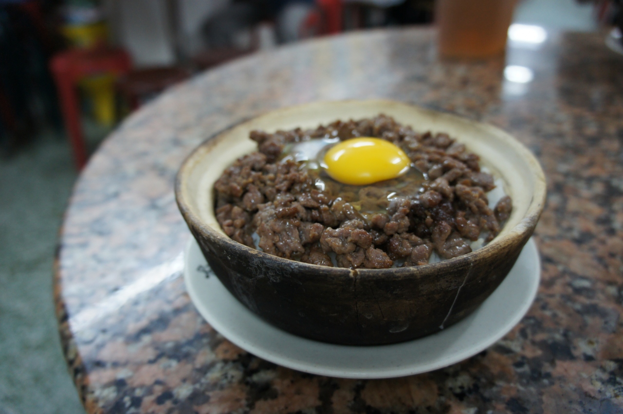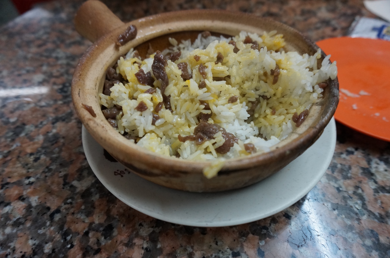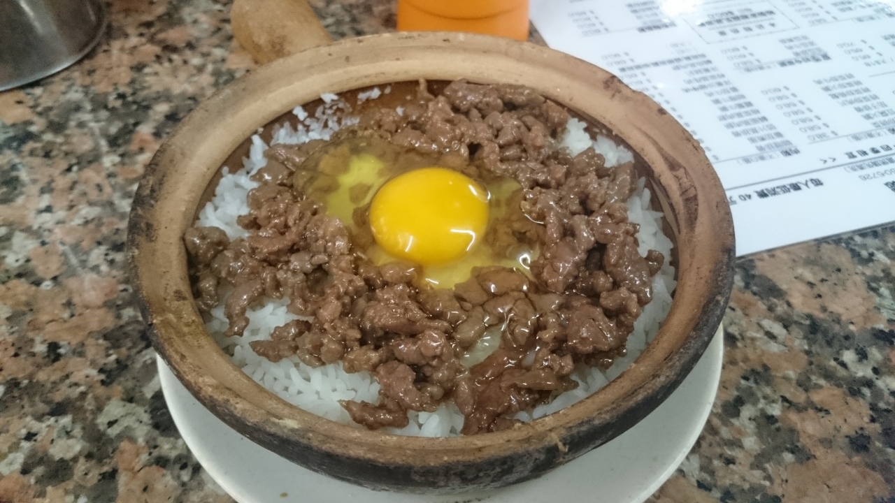 14時半頃にお店に行きましたがお客さんがたくさんいました。なので席はあい席ローカルな雰囲気に圧倒されつつ観光客用の英語表記... 続きを読むのメニューがある。 煲仔飯だけでも何種類もあり、よくわからないのであい席した隣の女性にお勧めを聞いたら牛肉のミンチを提案されたのでそちらを注文しました。上に乗っている卵は生でも焼きでも選べる。
