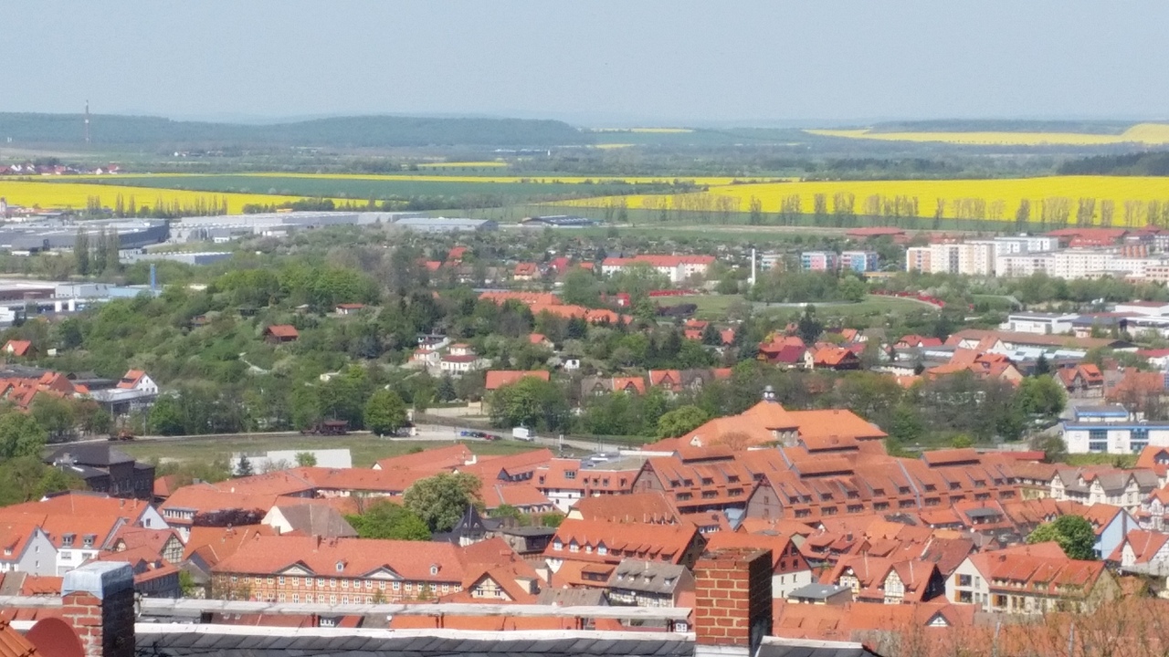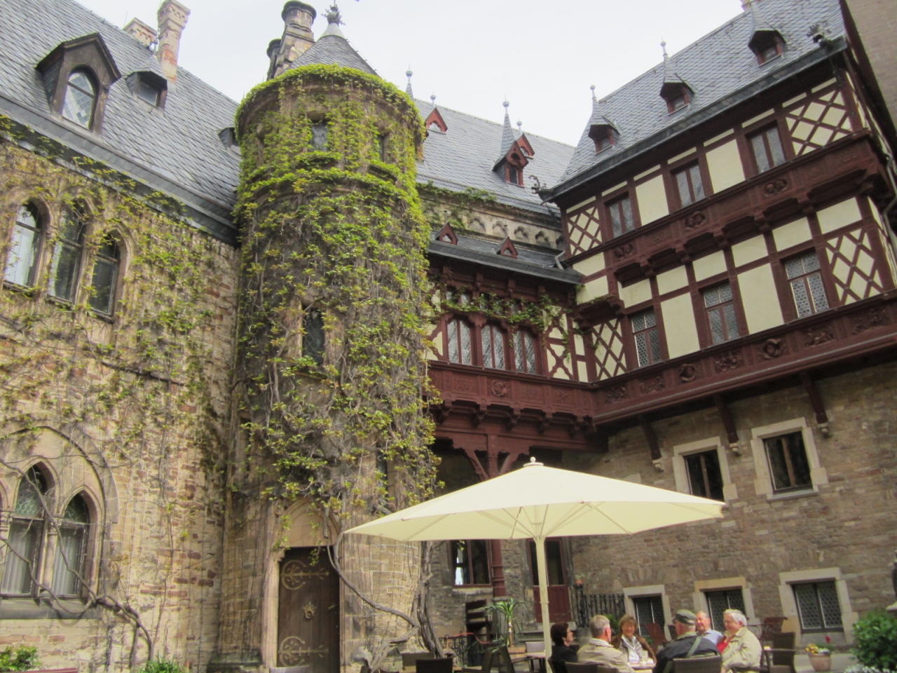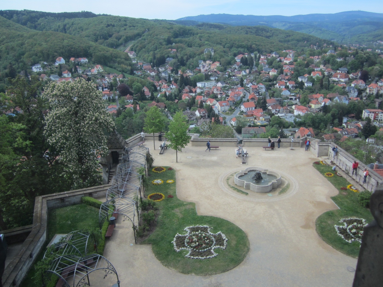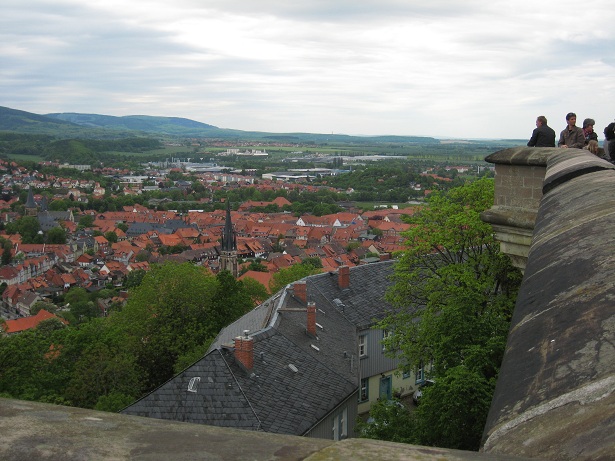 ヴェルニゲローデ城のテラスからは、町々の赤レンガ屋根の家並み、濃さを増してきた緑の森と、実に美しい景観を眼下に見ることができる。