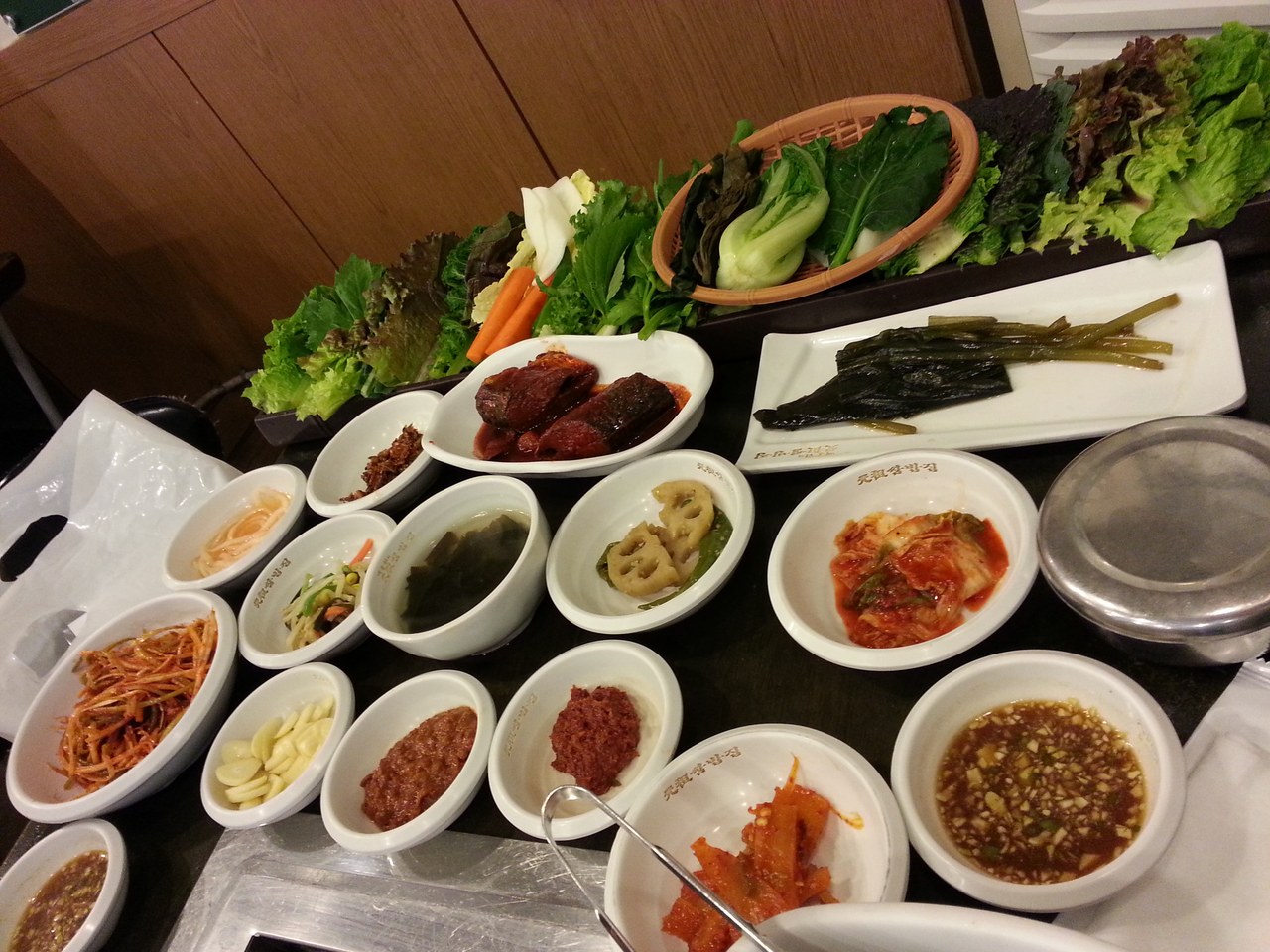 すぐにおかずや味噌チゲ、ワカメスープ、タレ、たくさんの包み野菜、ごはん、豚の薄切り三枚肉がテーブルいっぱいに並べられ、あまりの多さに驚きました。