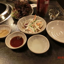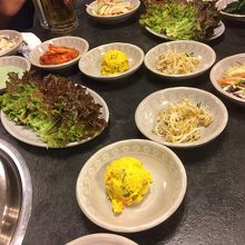キムチや野菜、ニンニクなどがついており、巻いて食べる。
