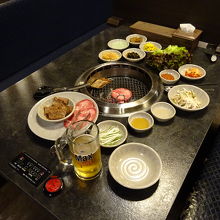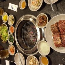 みんなが注文... 続きを読むしていたようなのでチャドルバギを2人前と味付きカルビ、海鮮チジミを注文しました。待っている間にいろいろキムチなど惣菜がたくさん並びお肉が来たらお店の方が写真を撮ってくれました。
