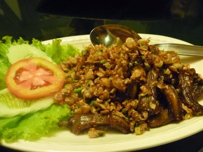席に案内してくれ、すぐに英語メニューを持参した。蝦蛄(シャコ・100グラム140B)の揚げ物(ガン・トート)と空芯菜炒め(パッブンファイデーン 小・100B)とお茶とごはんを注文した。