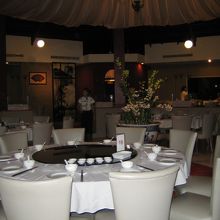 店内に入ると、中央が段差になっている、下のフロアーは広い、そして高いフロアーの天井にテント(パオ)風のインテリア。