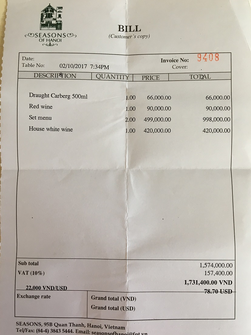 こんな素敵な雰囲気のお店で、美味しく食べて飲んで1731400ドン(78.7US$)日本では考えられません。ハノイに住んで通いたい・・ 閉じる投稿日:2017/10/27