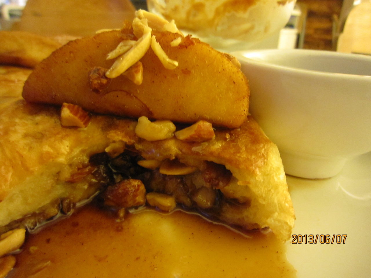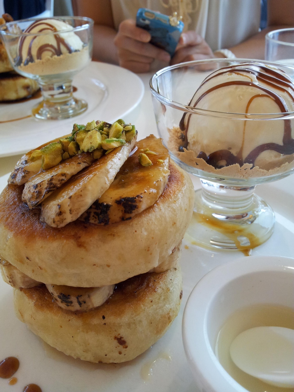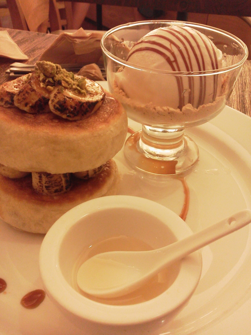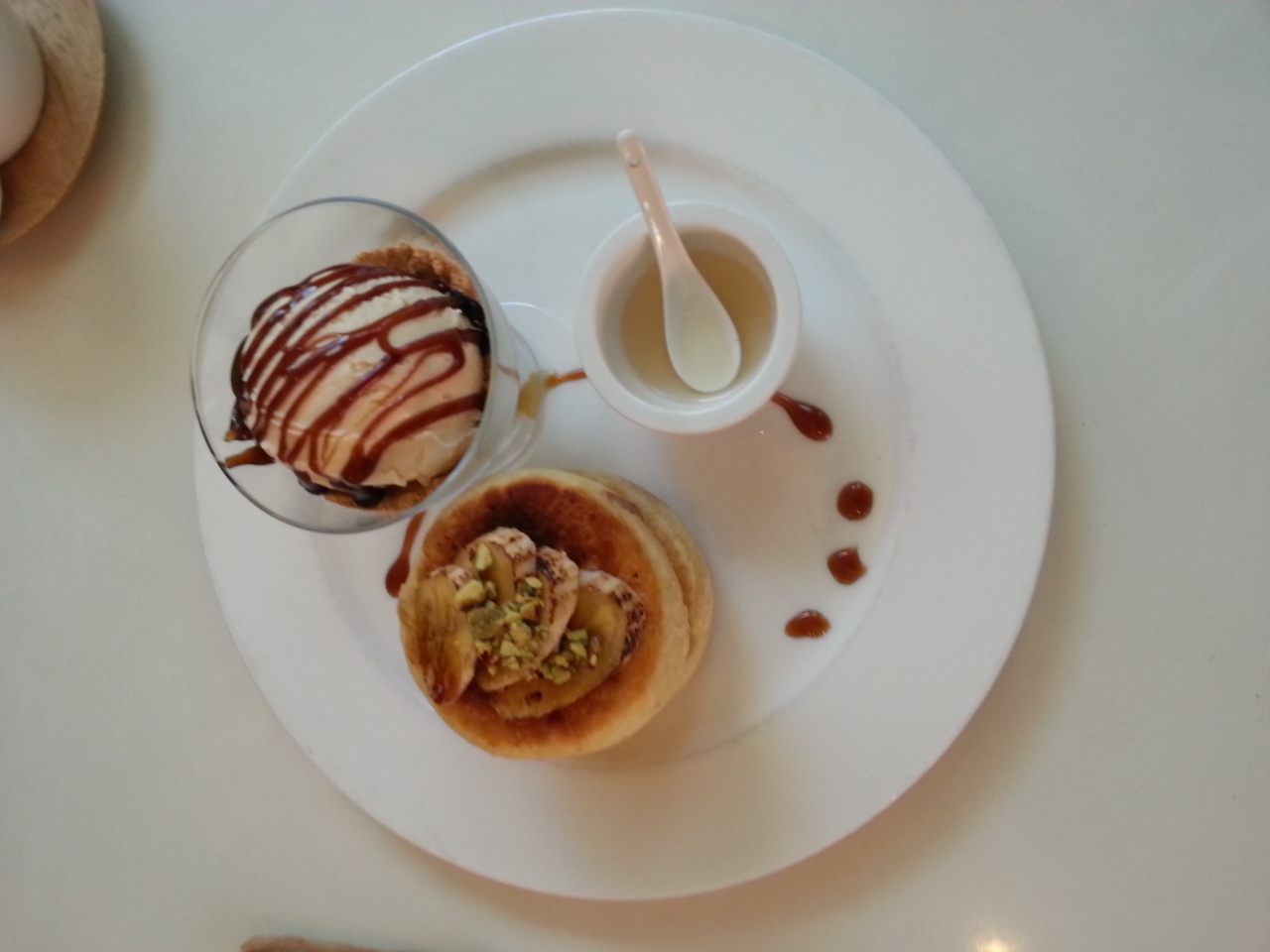 ホットクが2枚パンケーキ風に重ねられた上にバナナとナッツ(ピスタチオ?)が乗っています。