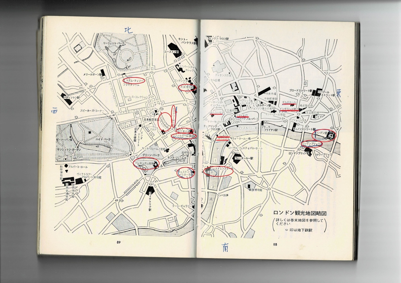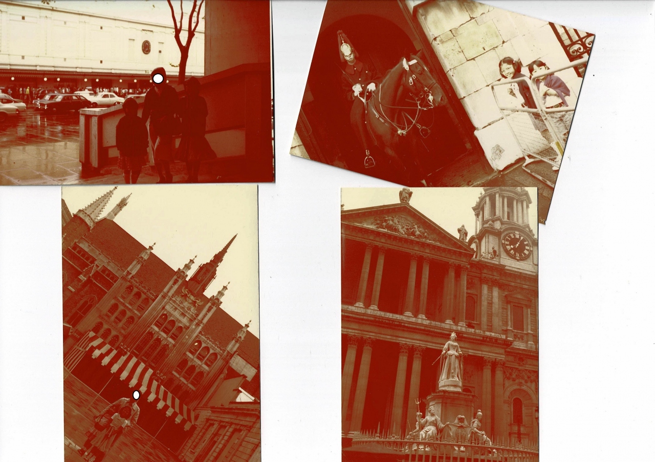 右上・騎馬の衛兵、左下・ギルトハウス、右下・イングランド銀行
