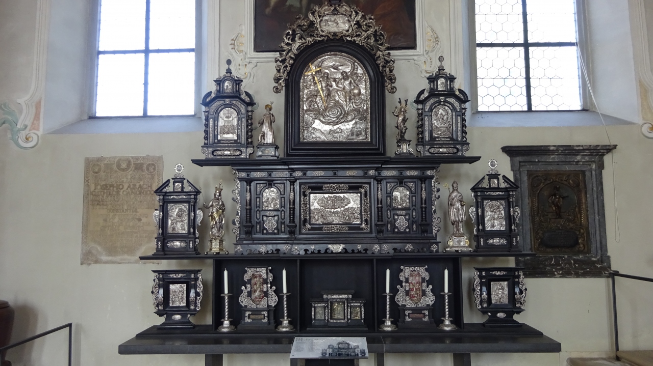バロックの主祭壇の両側に2基づつ副祭壇があり、なかなか見栄えのする内陣でした。その横にあった銀の祭壇は、特別な催しの時に主祭壇の前に設置されるという、この教会のお宝のようです。