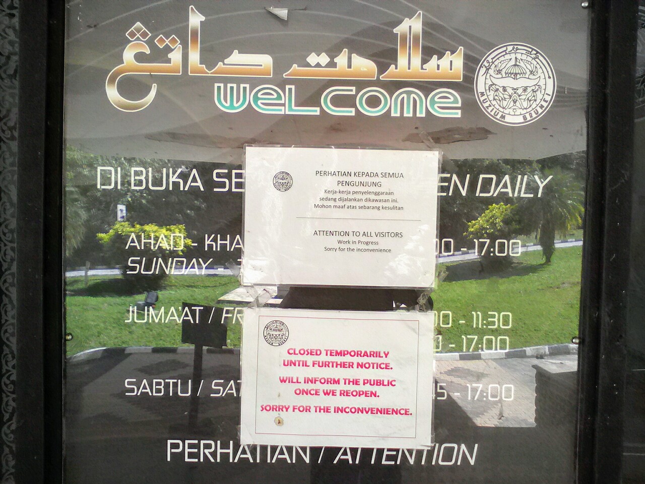 BSBの東方、4kmほどのKota Batuにあるブルネイ博物館(Musium Burnei)です。しかし現在閉館中です。... 続きを読む入口の扉には「追って通知するまで一時閉館、再開の際にはお知らせします」の張り紙が…。中を覗くと“もぬけの殻”状態でした。いつ再オープンかとツーリストインフォメーションで尋ねると「わからない」との答え。アジアあるあるですね。神のみぞ知るということなのでしょう。