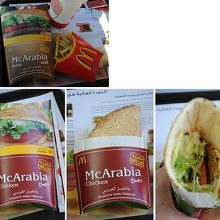 マック・アラビアは、アラビア式の平たいゴマ入りパンに、パテと野菜(レタス、トマト、玉ネギ)、そしてマヨネーズ・ソースを挟んだ物。パテはチキンとコフタの2種から選ぶようになっていました。