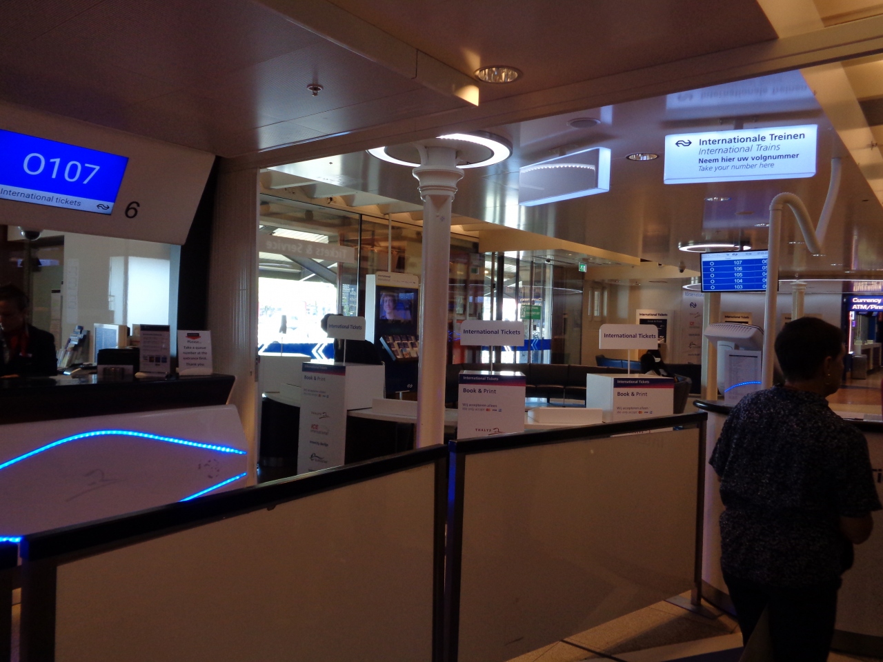 国内列車の切符は券売機で買えますが、国際列車の切符は窓口で購入します。窓口は駅に入って左手奥。受付で目的を告げると、銀行の... 続きを読むように番号札を発行してくれるので、モニターにその番号と窓口番号が表示されるのを待ちます。