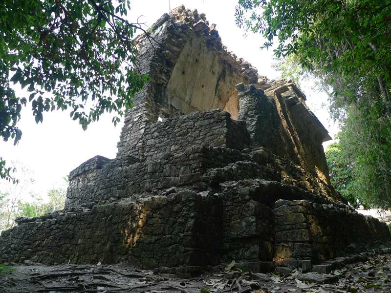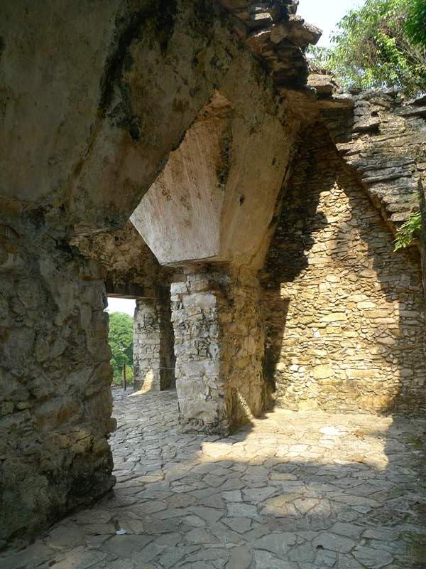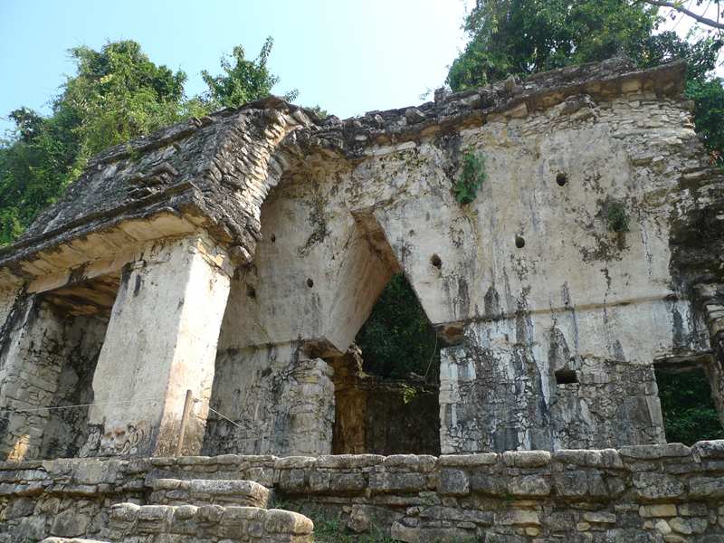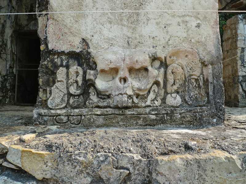 見所は、神殿正面のマヤアーチと柱の下にある下にある頭蓋骨の漆喰彫刻。