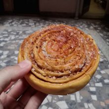 ジャーマンベーカリーを冠した店は世界中にあります。基本的にはパン屋ですがここメインバザールにあるお店は料理の方が充実してい... 続きを読むます。インド、西洋、チベット各種一通り揃っています。しかしパン屋はパン屋と言うことでパンを買うことに。だけど種類が少なくショボーい。おそらく毎日は焼いていません。数少ない中から「CINNAMAN」(35Rsシナモンロールのようです)をチョイス。テイクアウトというとちゃんとアルミケースに入れてくれました。で、お味は…硬ーい!中心部は若干しっとりしていましたが外側はカリカリパサパサ状態。何日前に焼いたのかなって感じです。ジャーマンベーカリーを名乗るくらいならもう少しちゃんとした物を出してほしいです。