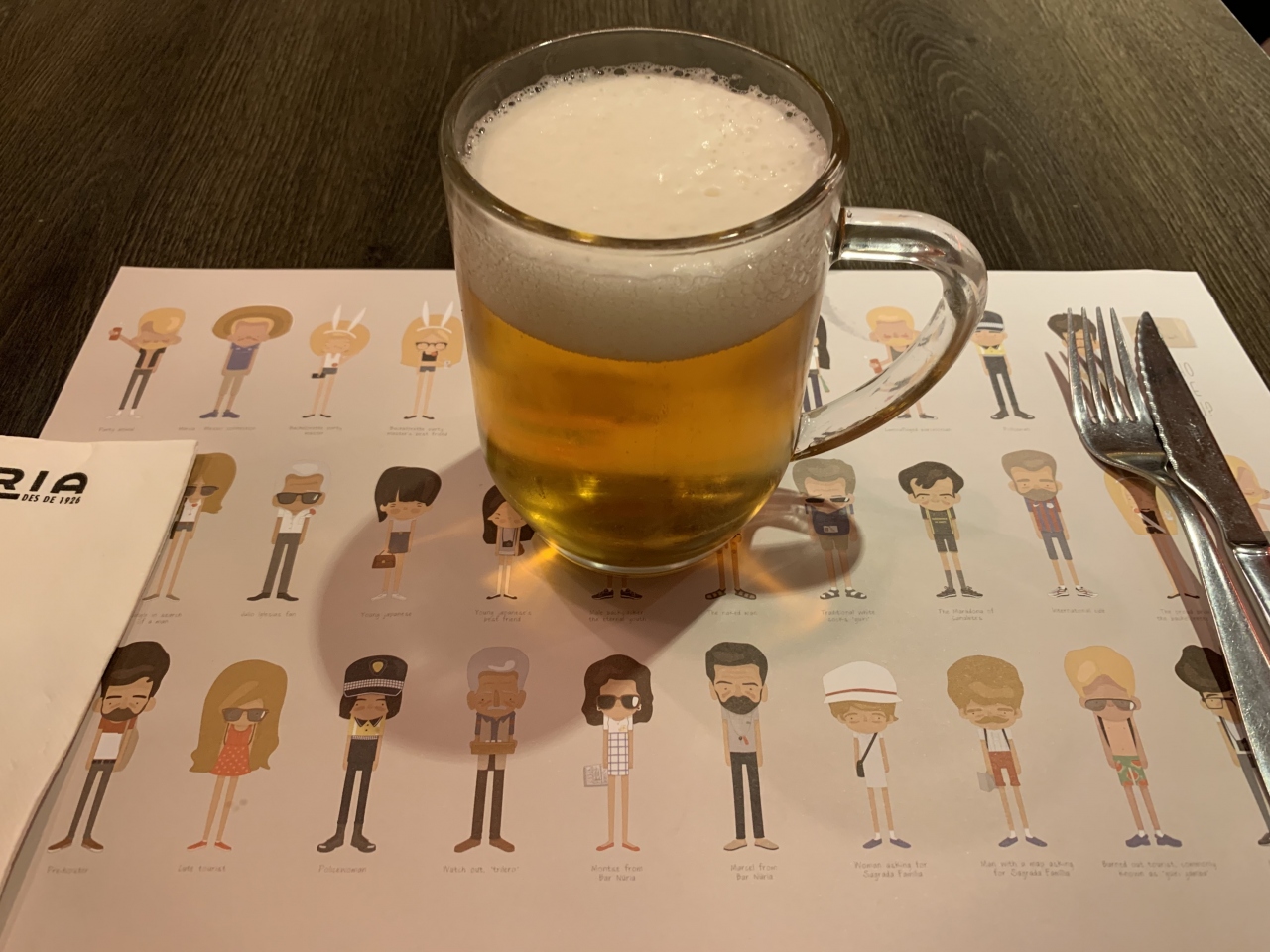 ホテルの前のランブラス通りを少し歩いて見つけたこのレストラン、入口にメニューが出ていて「おつまみ3種、ビール1杯のセットで18.50ユーロ」というのがあったので入ってみることにしました。