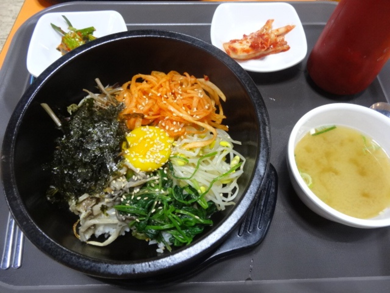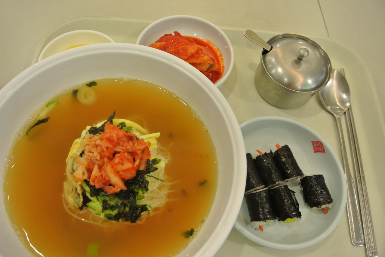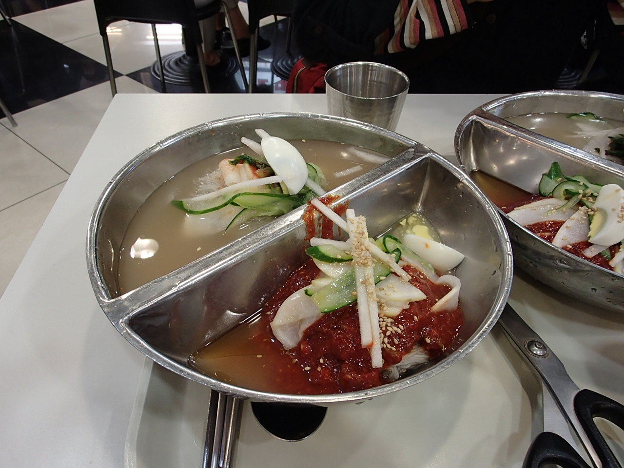 カップル麺」冷麺とビビン麺が半分ずつひとつの器に入っています