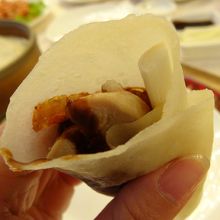 北京ダックは、目の前で切り分けてもらい、お店のスタッフの人が包み方を教えてくれました。