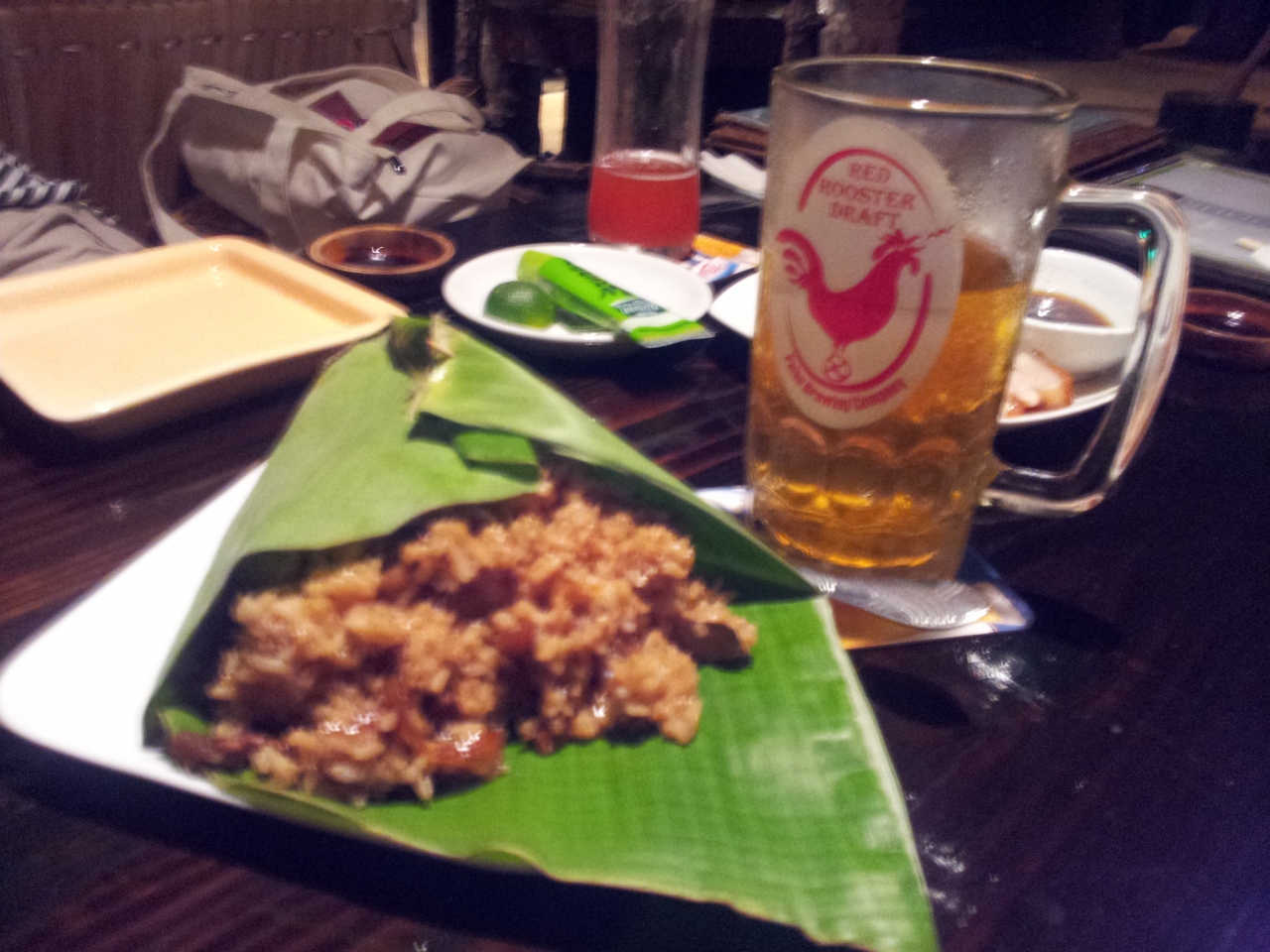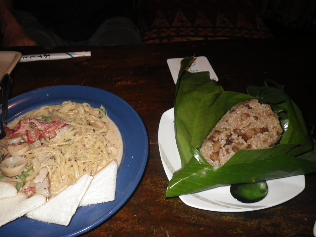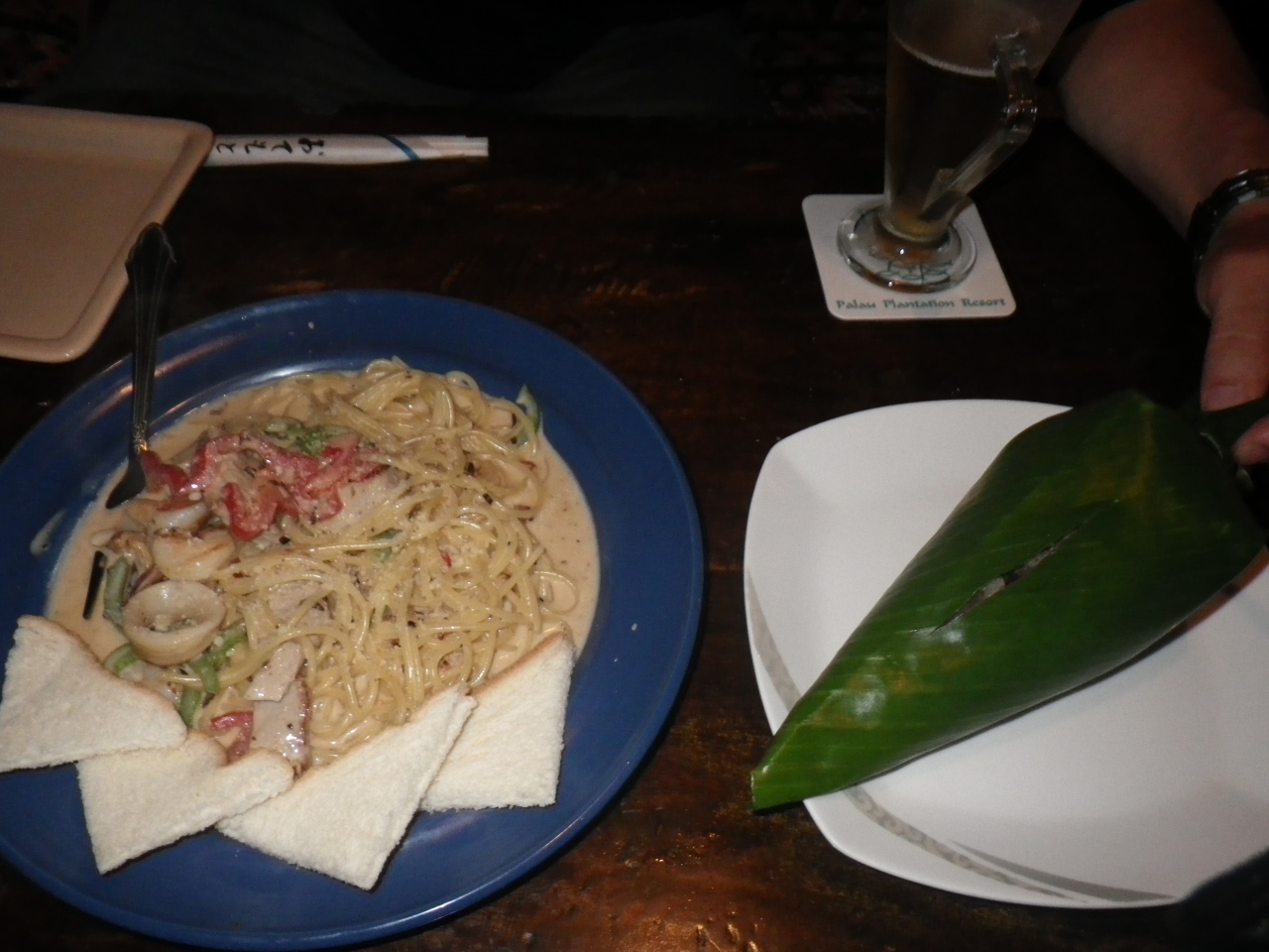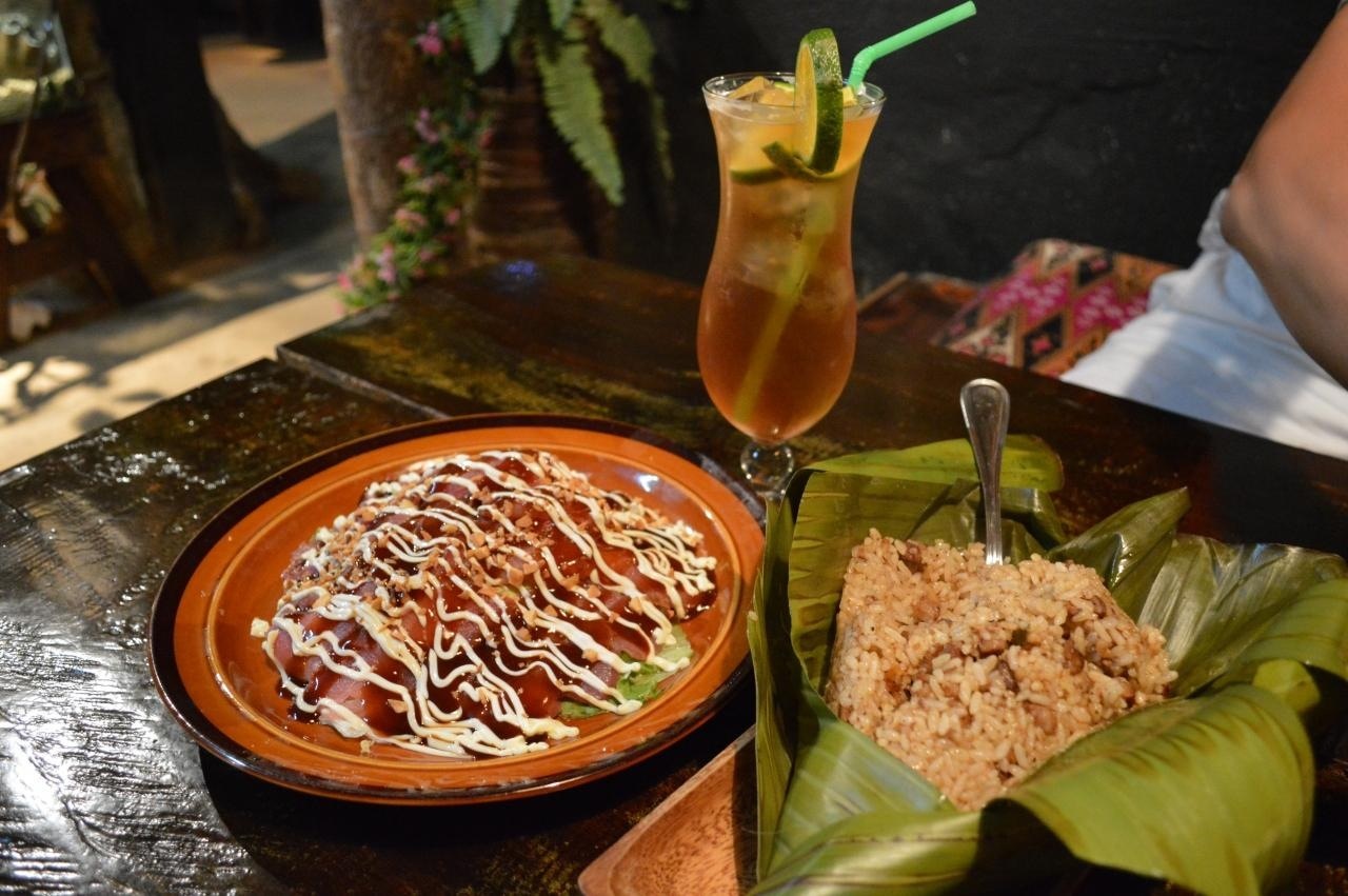 プランテーションリゾートのマングローブスパを利用すると、宿泊しているホテルから往復送迎してくれます。スパ後に立ち寄って食事... 続きを読むすることにし、18時開店まで待って一番乗りしました。クーポンを持っていたのでビール1杯無料。いろいろ創作メニューもあるのですが、写真がないのでイメージわかず。個人的に食べたかったタイカレーパスタ12$と口コミで有名なジャングルライス9$を注文してみました。ジャングルライスはバナナの皮に包まれたいたおこわのよう。エマイメレイやカープレストランの炒飯と異なりしっかり味がついていて、主人はこれはいいと気に入ったようです。タイカレーパスタも美味。スパゲティの量が少ないですが、シーフードの具あり。添えられていたパンにおいしいソースを付けて最後まで食べました。個人的にはパラオで食べた中で一番好きかも。