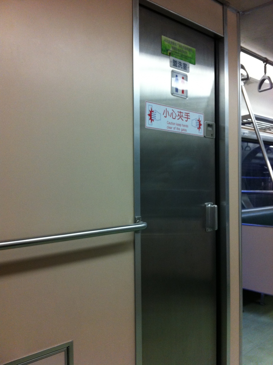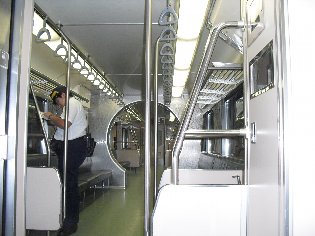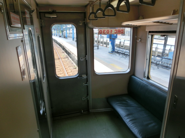 通勤電車用の横長シートと座席者とが連結して有って車両連結部分は丸い通路に成ってるのが面白い!