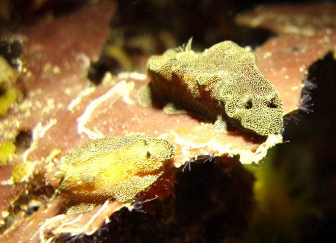 ウミウシの写真を撮る人はいても、そこから全く動かないウミウシの場合、動画を撮る人は滅多にいないかよほどの暇人か(笑)...でも私はこの日、新しい水中ライトとカメラのテストも兼ね、たまたまあるウミウシを動画撮影していたのです。 そしたらなんと!ウミウシが水中ライトの光に反応し、イカのように体の色をピコピコと変え出したのです。 ちまたでは暗いところで”光る、コノハウミウシやヒカリウミウシ”、というのは有名ですが、水中ライトに反応してイカのように体色を変えるウミウシというのは聞いた事がありません。