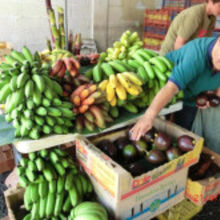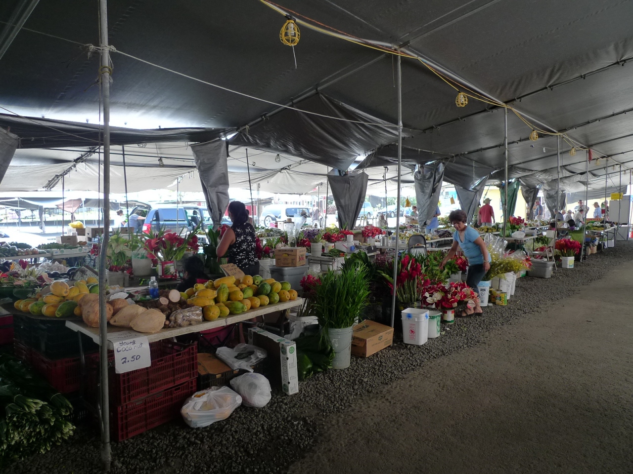地元で採れた野菜や果物、トロピカルフルーツをはじめ、手作りのパンやジャムなどを売る店が200も集まるファーマーズマーケットで、水・土曜が店が充実してにぎやかだそうです。