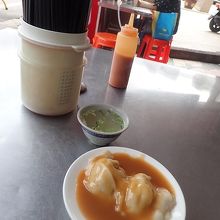 各テーブルに辛いソースが置いてあるので、お好みで肉圓に掛けても可。