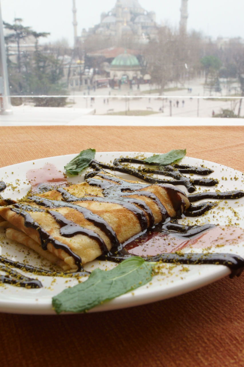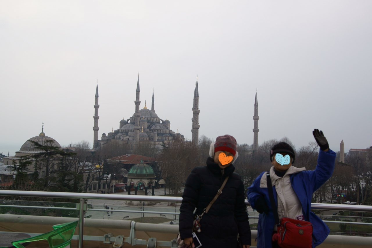 冬季はテラスにビニールをかぶせてあるので、寒い日でもブルーモスクの美しい眺望を眺めながらお茶することができます。ヒーターもあったので全然寒くありませんでした。