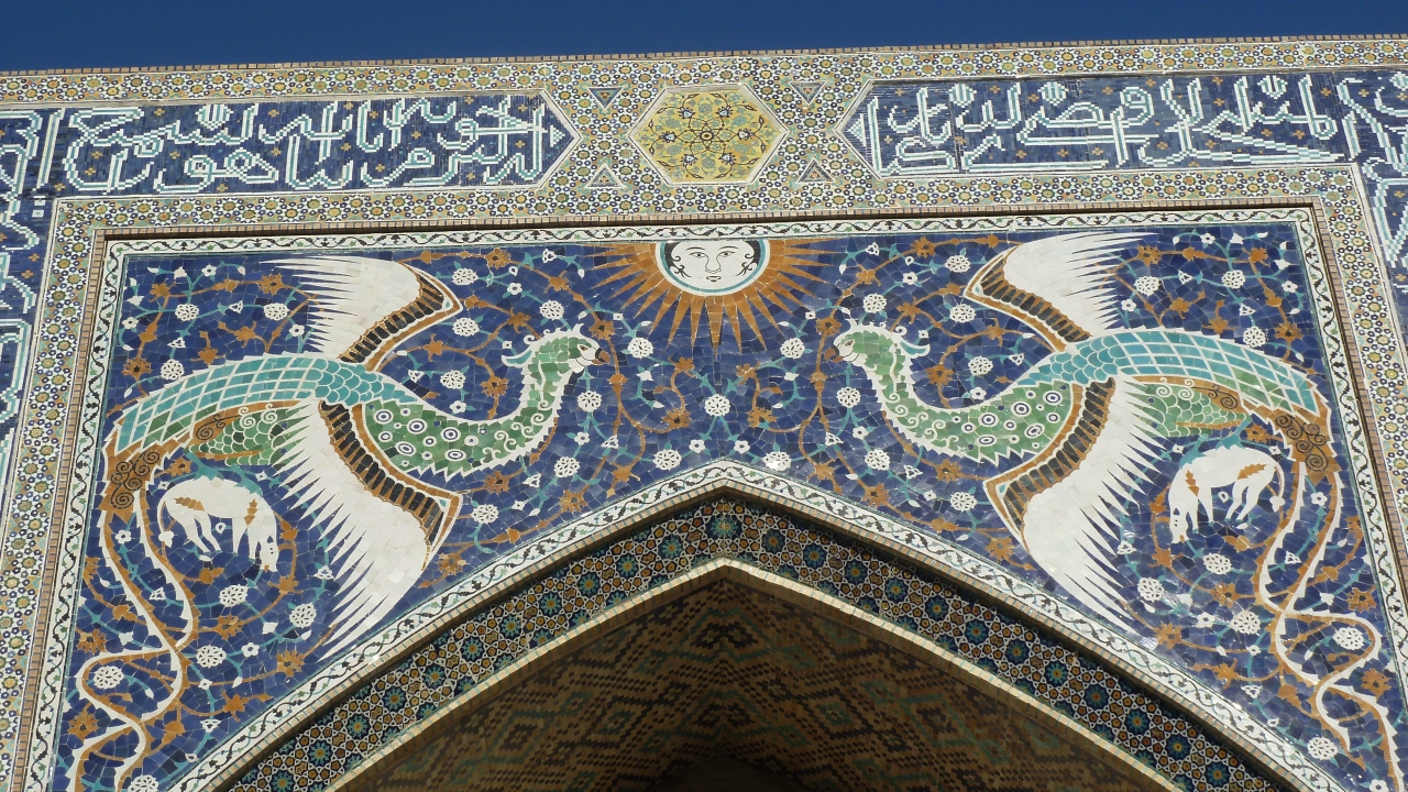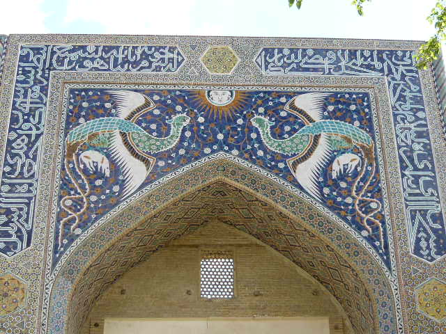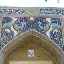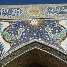 メドレセの入口のアーチはブルーのタイルが美しく、2羽の鳳凰と、顔が描かれた太陽の図柄でした。