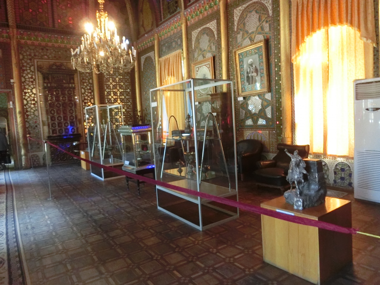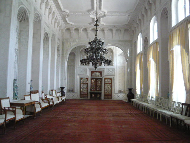 宮殿内の真っ白な壁と天井に赤い絨毯が敷き詰められた「白い間」は豪華なシャンデリアが素敵でした。このシャンデリアのために、中央アジア初の発電機が設置されたそうです。