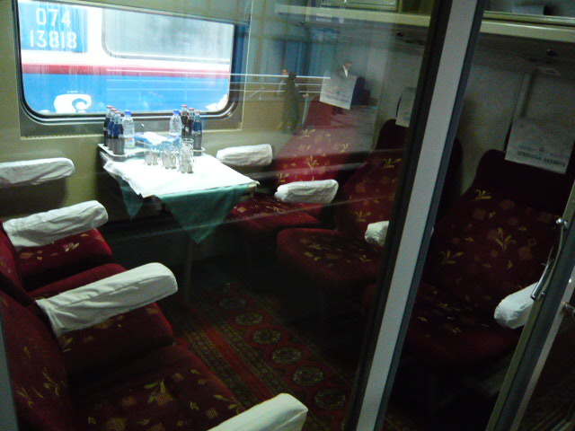 列車はオンタイムで発着、大して揺れないため乗り心地は日本の電車と変わりません。トイレと給湯器あり。途中に1度だけコップ一杯のお茶をくれます。