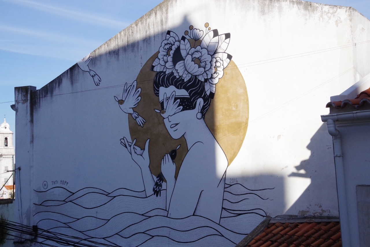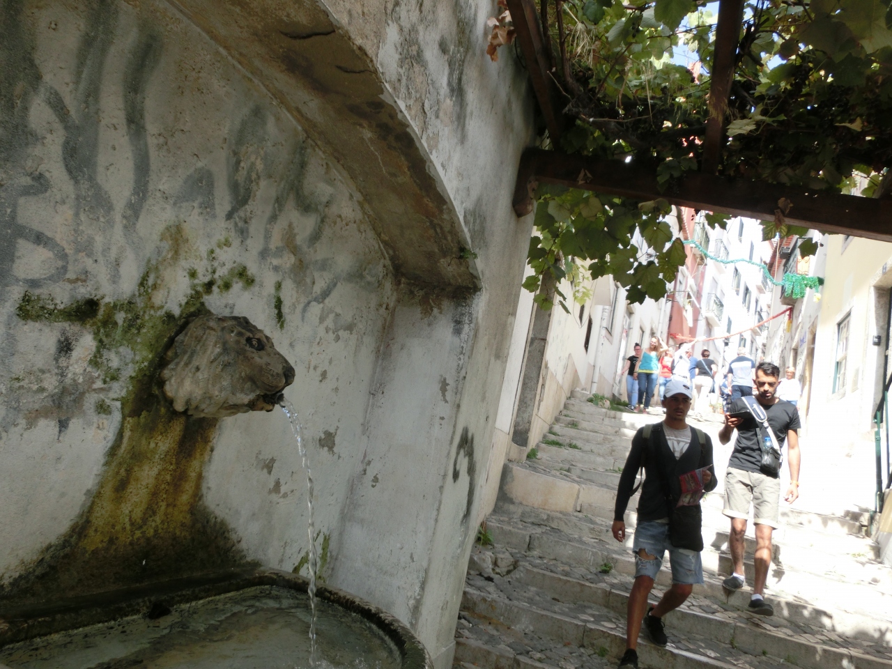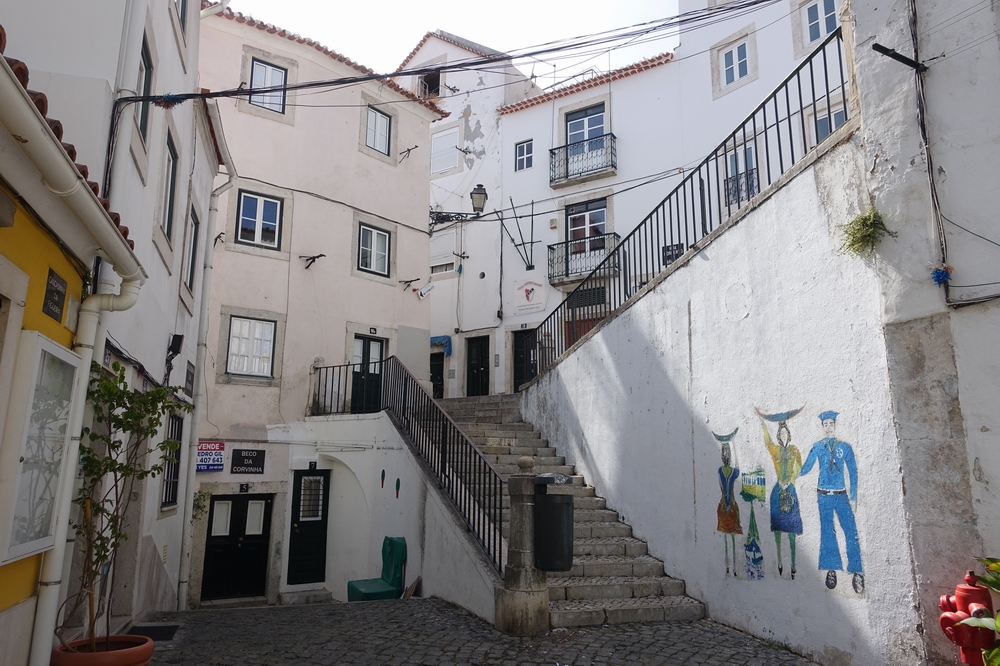 ポルタス・ド・ソル広場脇の階段を、サン・ミゲル教会方面へ下りていくと、リスボン最古の町並みが残るエリアに出ます。人一人し... 続きを読むか通れないような狭い路地や、階段、踊り場が続きます。アルファマとは、「泉」という意味ですが、公共の洗濯場らしい泉も見かけました。古い建物の壁にアートが描かれている家もあります。