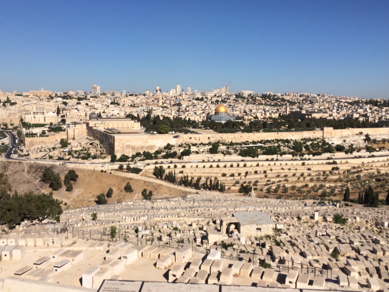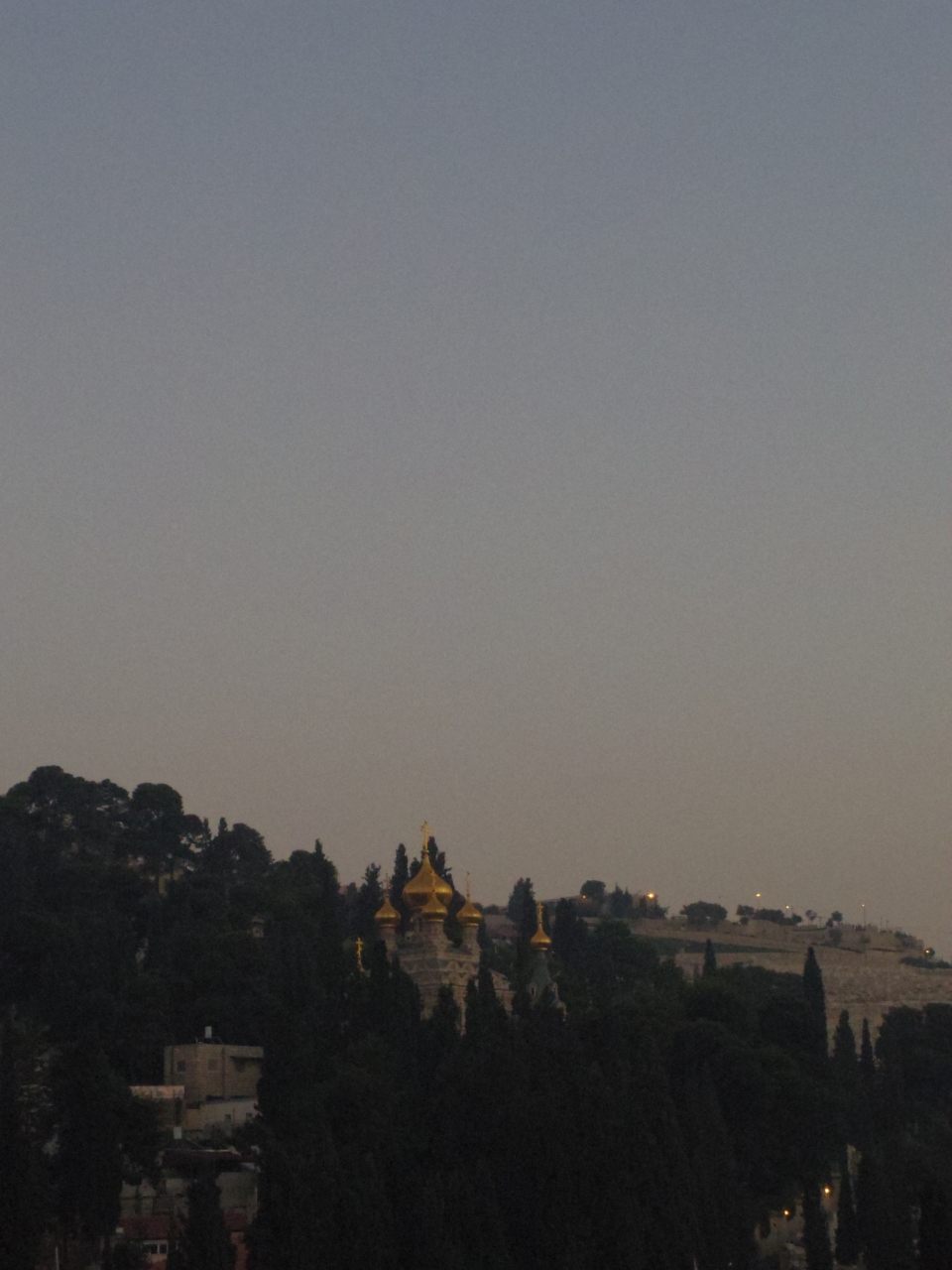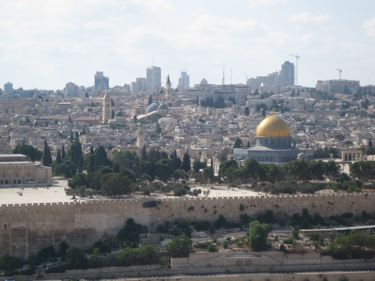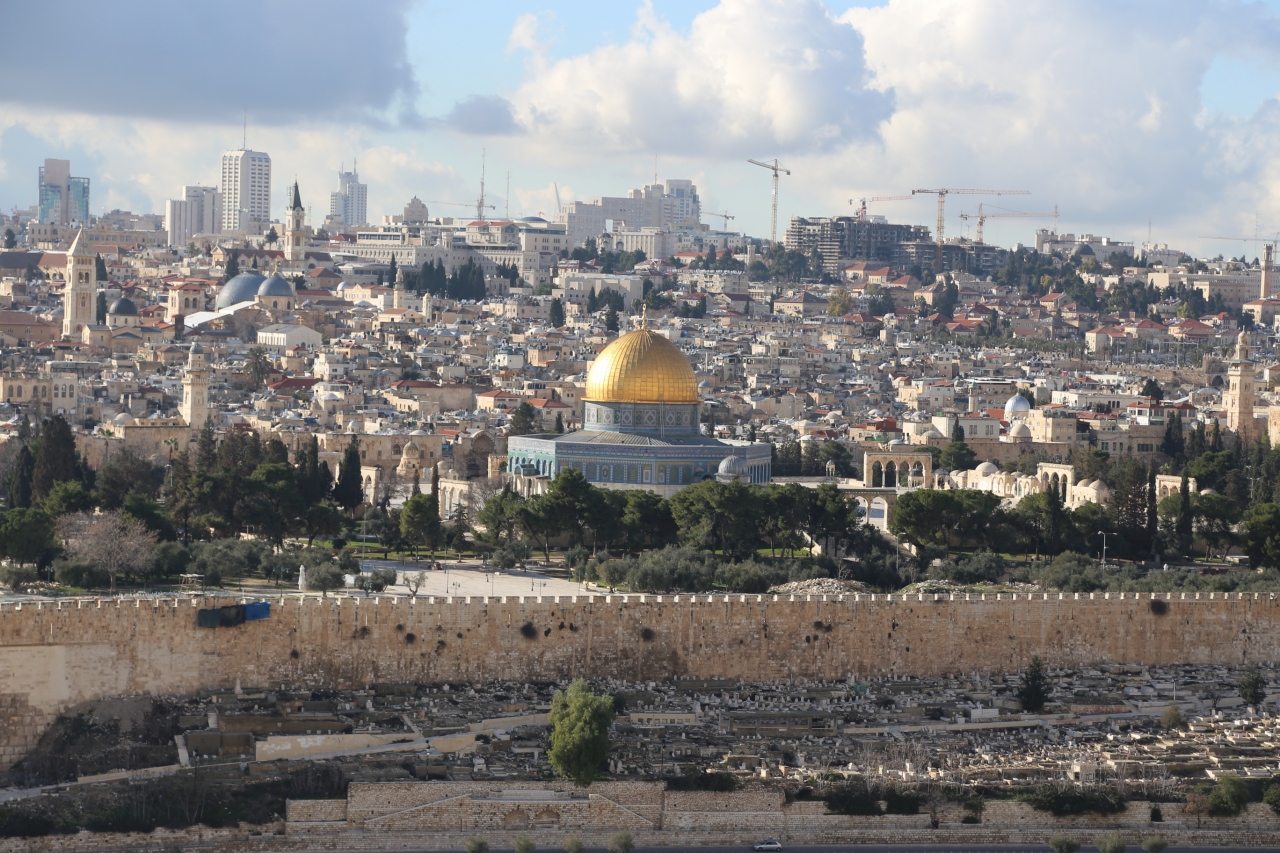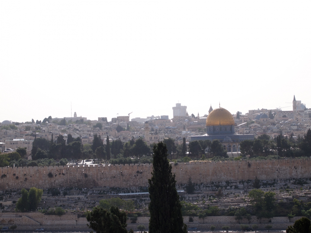 遠景に岩のドーム(金色の丸ドーム)が見えます