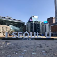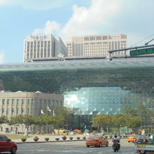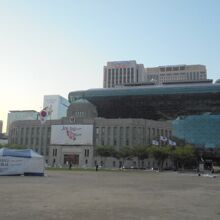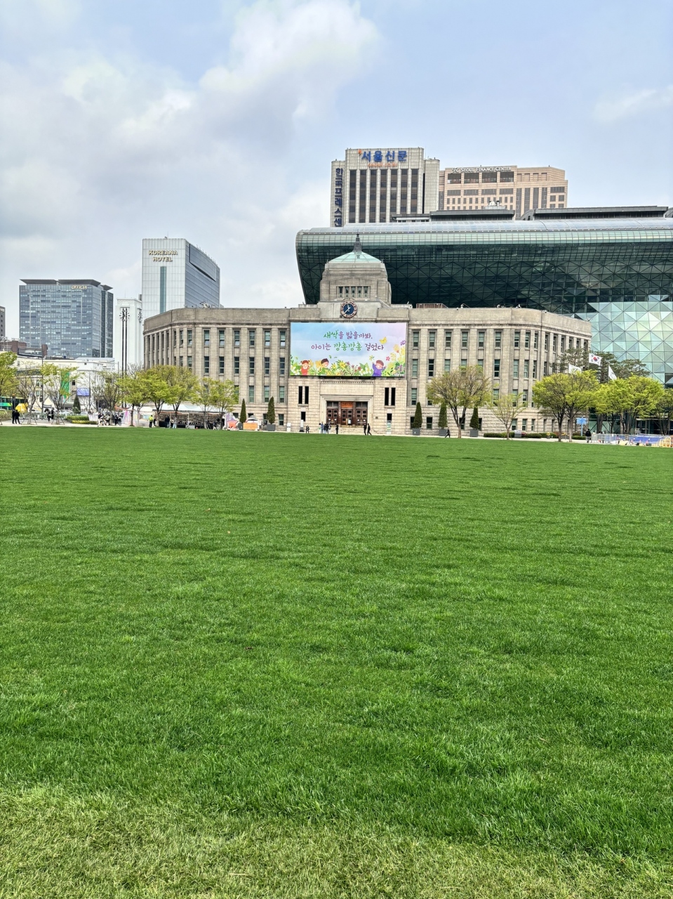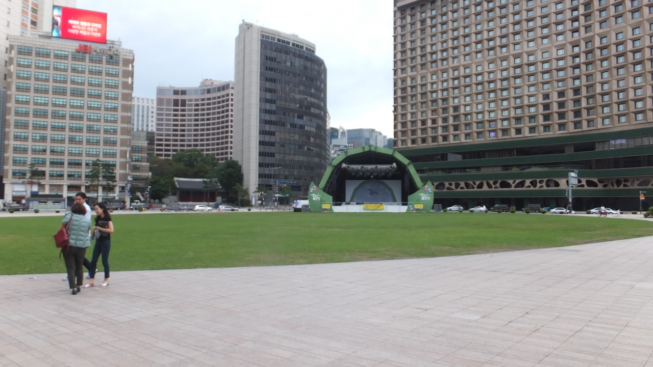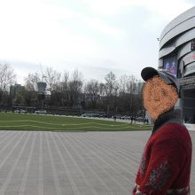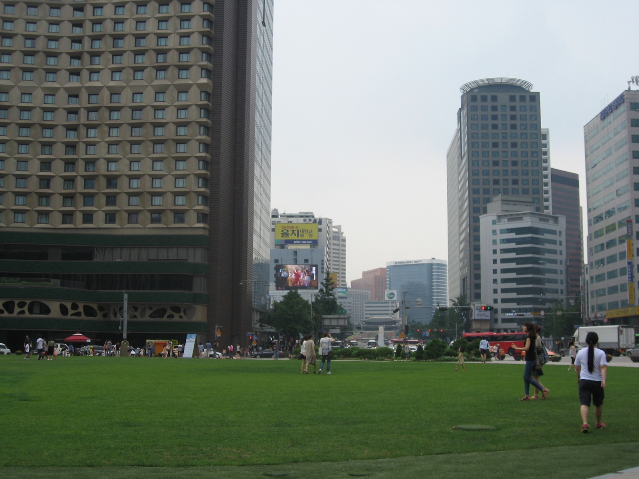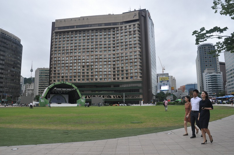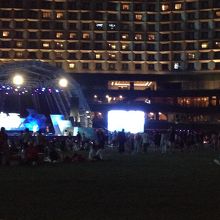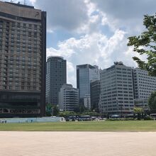 プラザホテルの前にひろがる広場。のどかな散歩の場所でもある