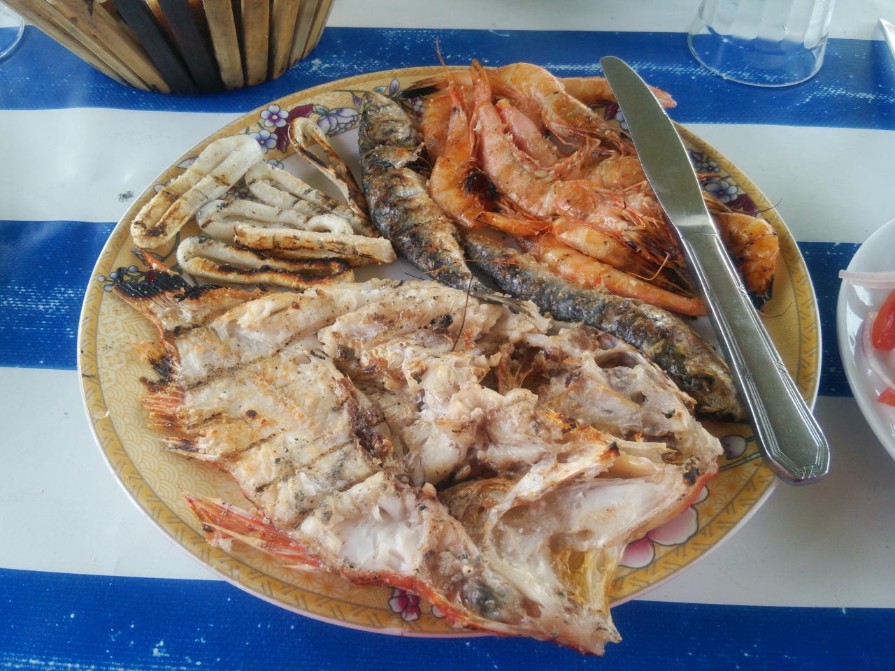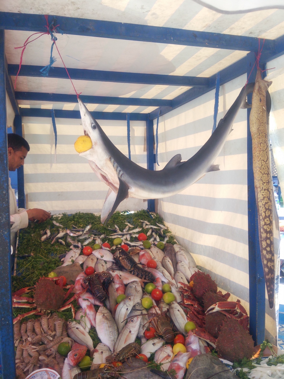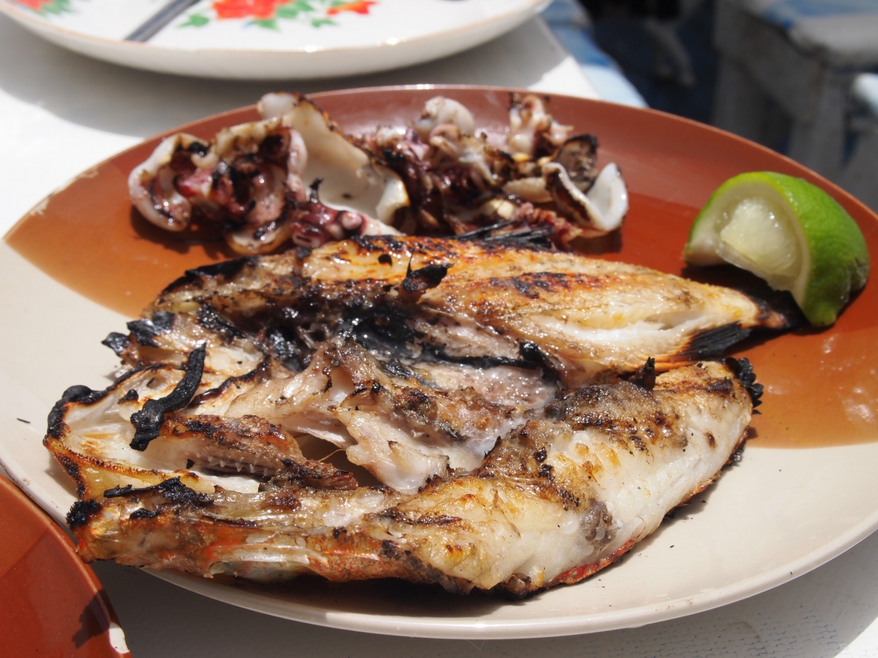 目抜き通りのムハンマド・ザルクトゥーニ通りRue Mohammed Zerktouniをひたすら西に進むと港へ続く「海の門... 続きを読む」(Porte dela Marine)へ出る。海の門をくぐると港に出る。港には屋台が立ち並び、こんがりと焼かれた魚の匂いに誘われる。魚を焼いてもらうのは値段交渉制。いろいろ見てから店に入ろうと思ったが、1件目で捕まってしまった。たくさんの魚の中から舌平目と赤い魚2種類、海老、イカの切り身を選び、サラダとドリンクを付けて2人で130DH(約1300円)という提案にすぐに釣られてしまった。魚介類は海老から始まりひとつずつ炭火焼きにされてでてきた。どれもうまい。これだけたらふく食べたら他の国ではいくらかかるかわからないと思う。