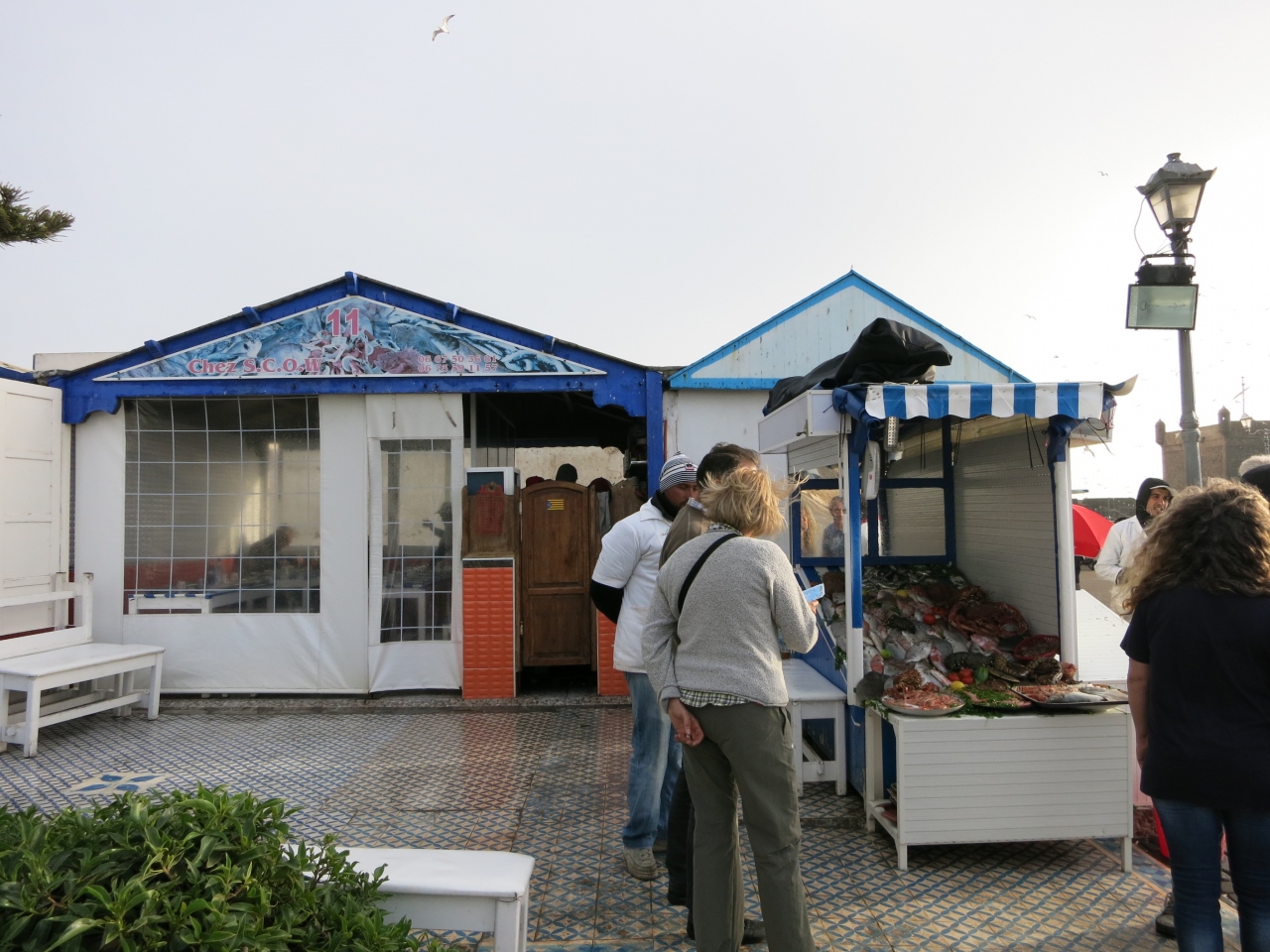 ムーレイ・エル・ハッサン広場のすぐ横(レストランと反対側芝生エリア脇)に10軒程の屋台がL字型に並んでいます。遮るものが無... 続きを読むいため全ての店を見渡せますが、店前の道は1本なので奥に行くには各店の勧誘合戦をかいくぐって行くことになります。ここの客引きはエッサウィラにしてはかなり強引ですが、体を引っ張ったりはされませんでした。