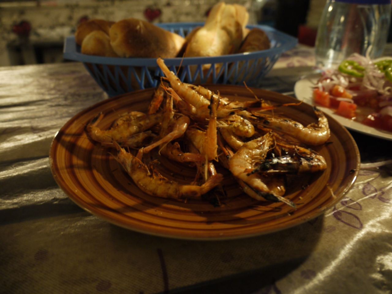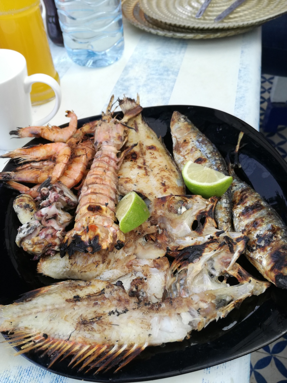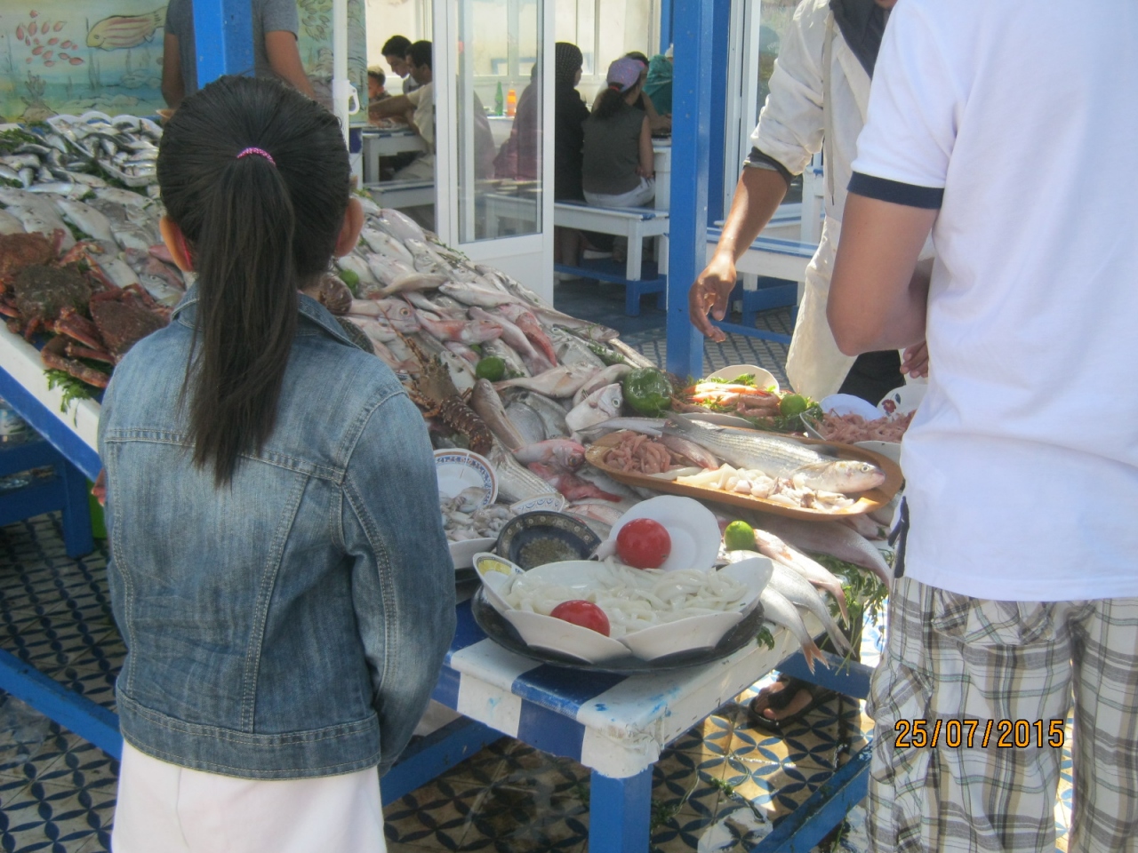 ロブスター1、エビ2、シャコ2、キンメのような魚1、イワシ4、焼きピーマン1、サラダ1、パン、モロッカンティー2、コーラ2で400DH。ディスカウントは要求しませんでした。